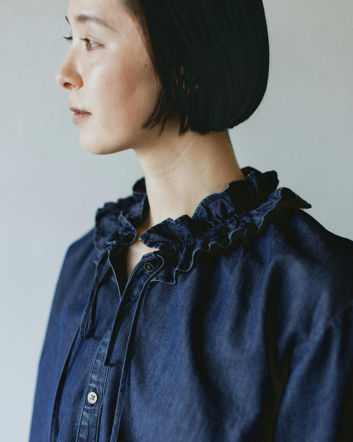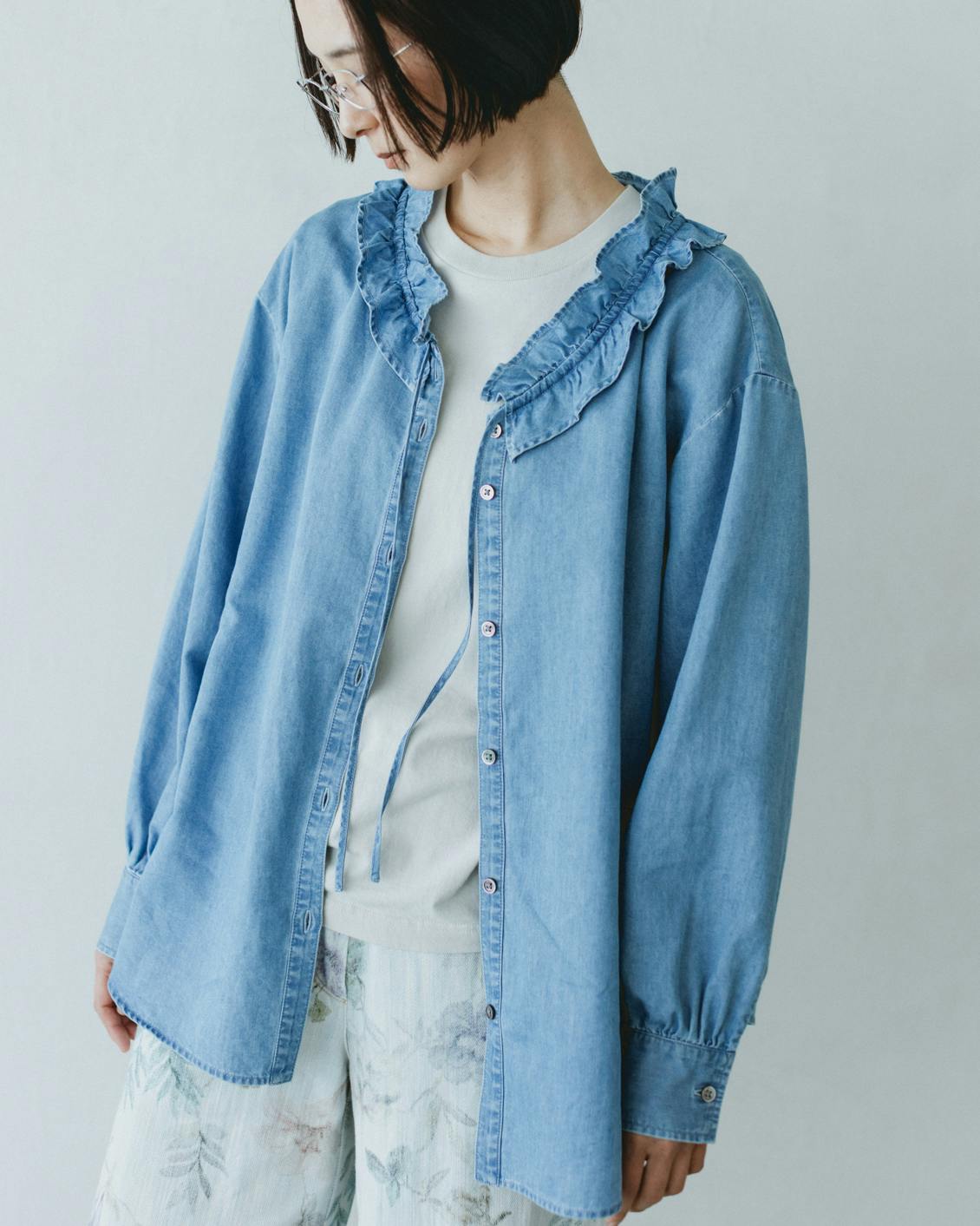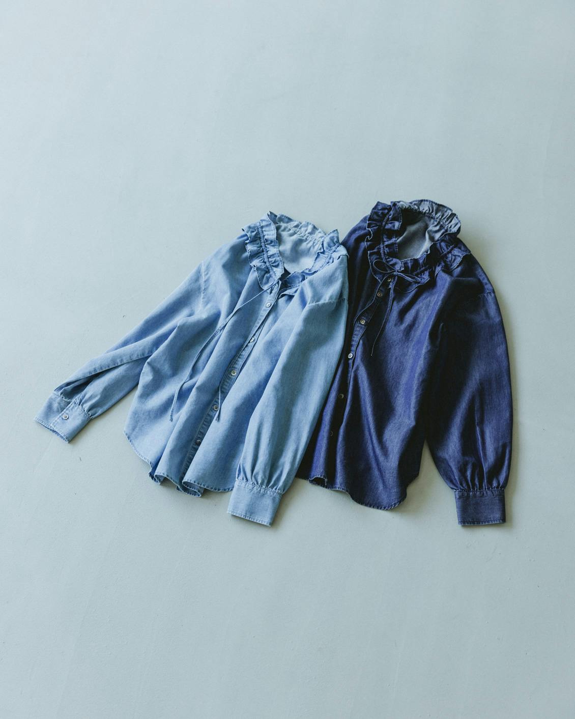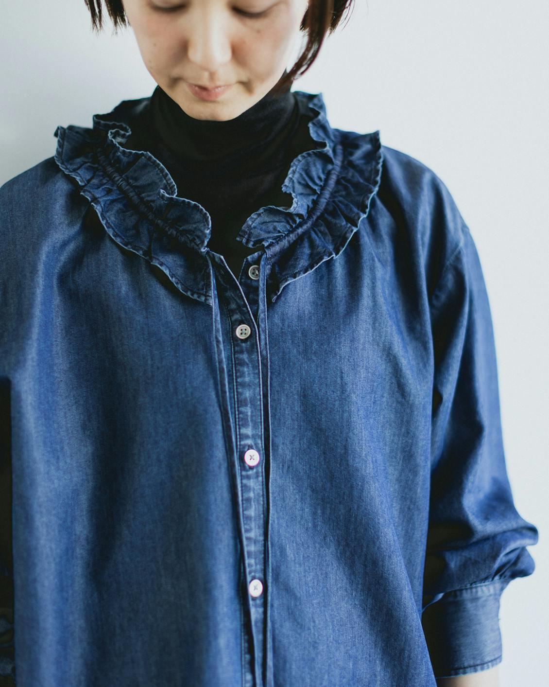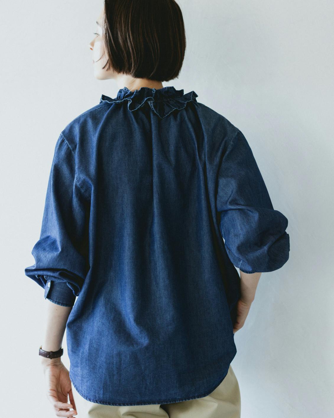 目指したのは、デニムのラフさとフリルの甘さが調和した、大人に似合うブラウスです。