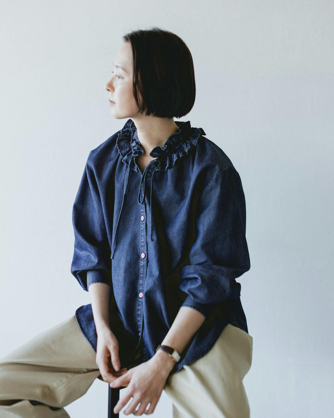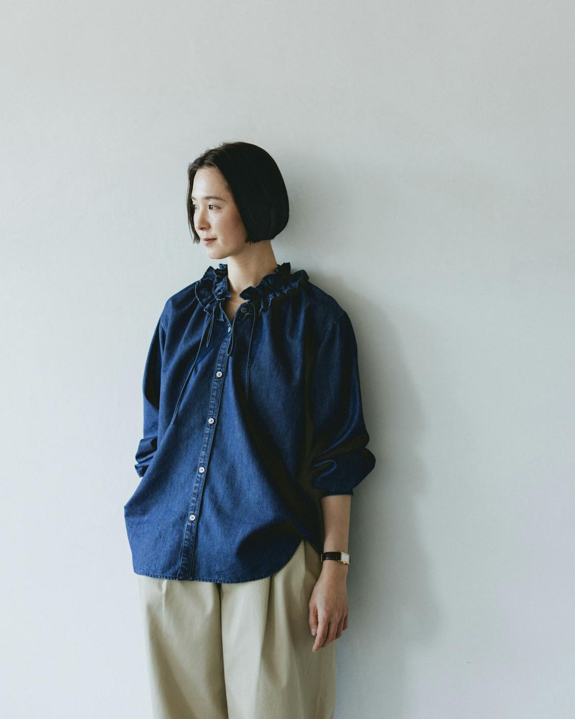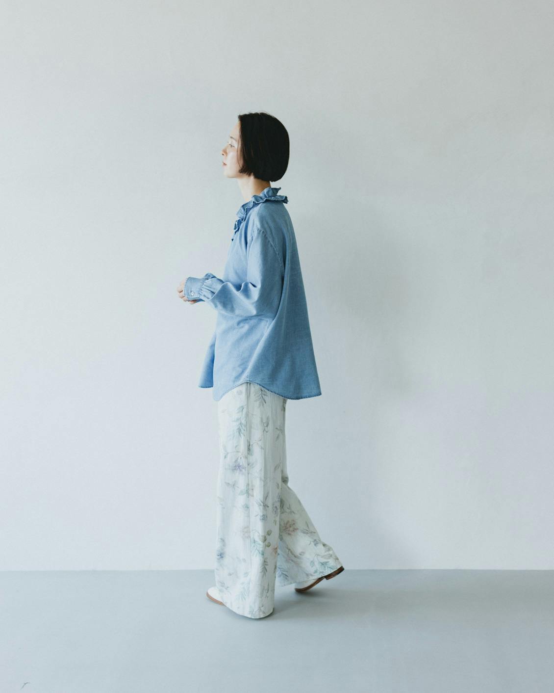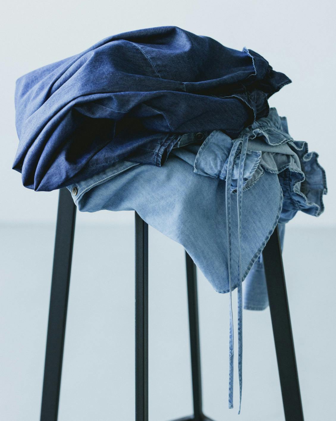 目指したのは、デニムのラフさとフリルの甘さが調和した、大人に似合うブラウスです。