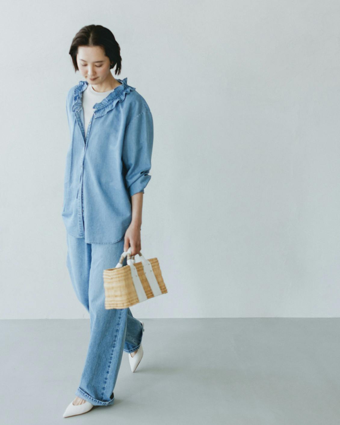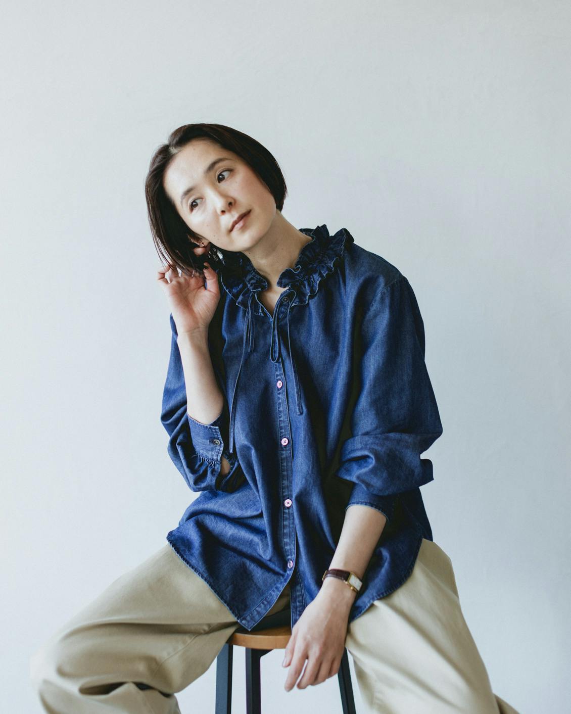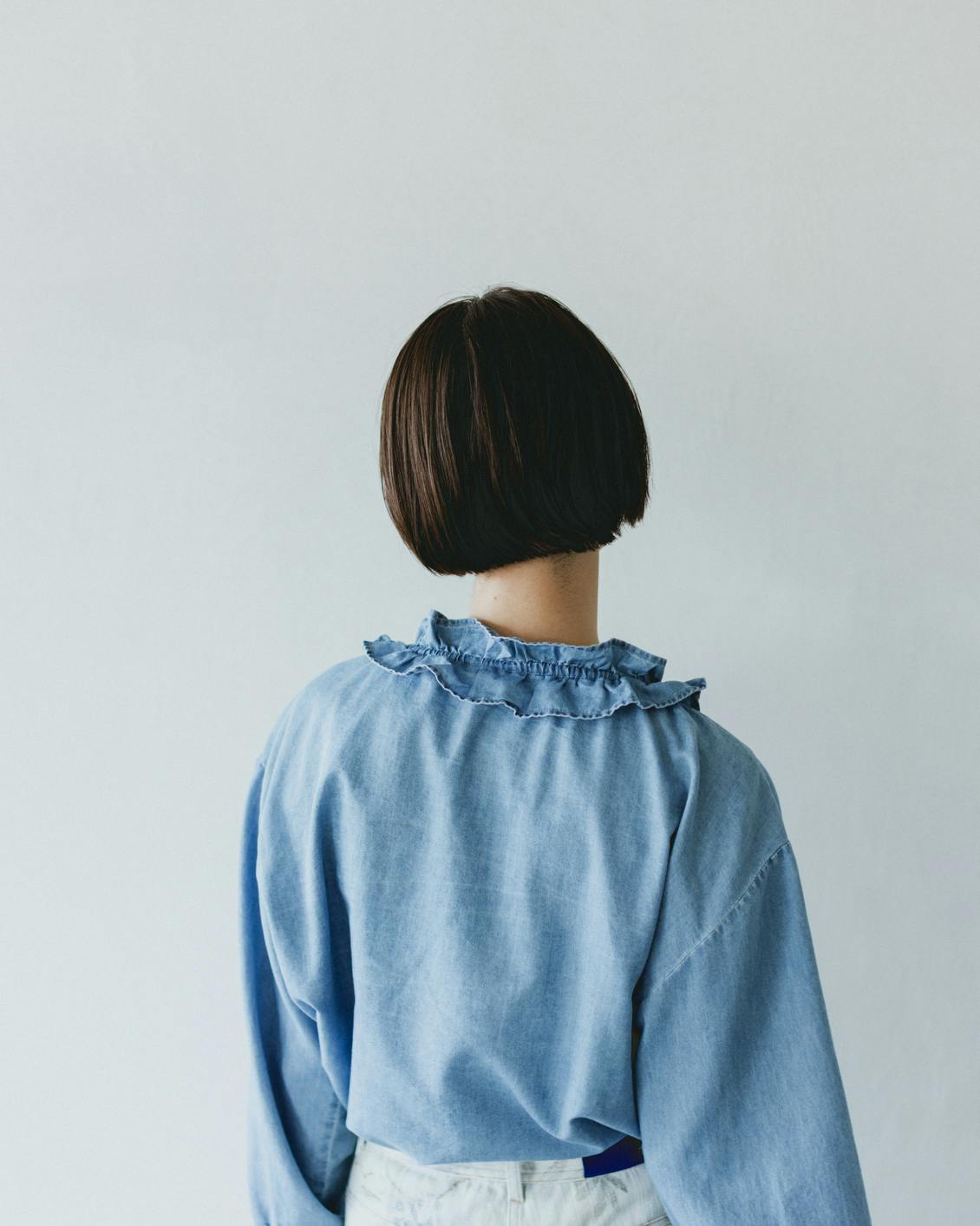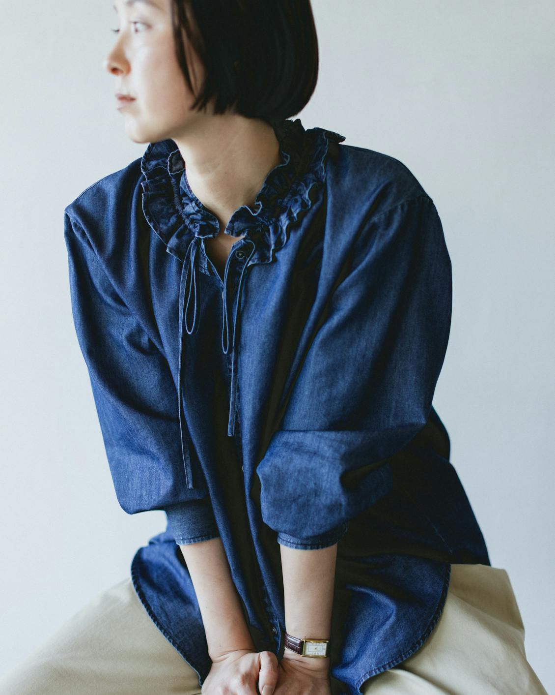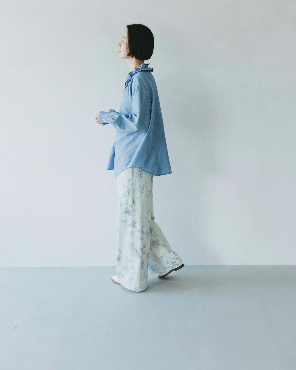 目指したのは、デニムのラフさとフリルの甘さが調和した、大人に似合うブラウスです。