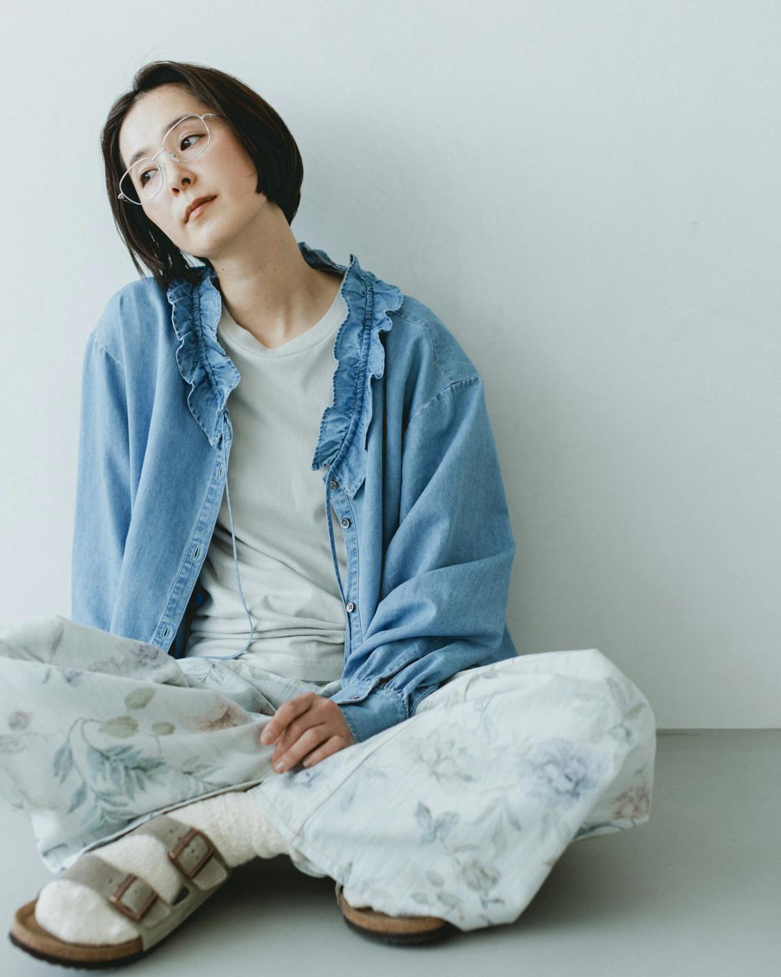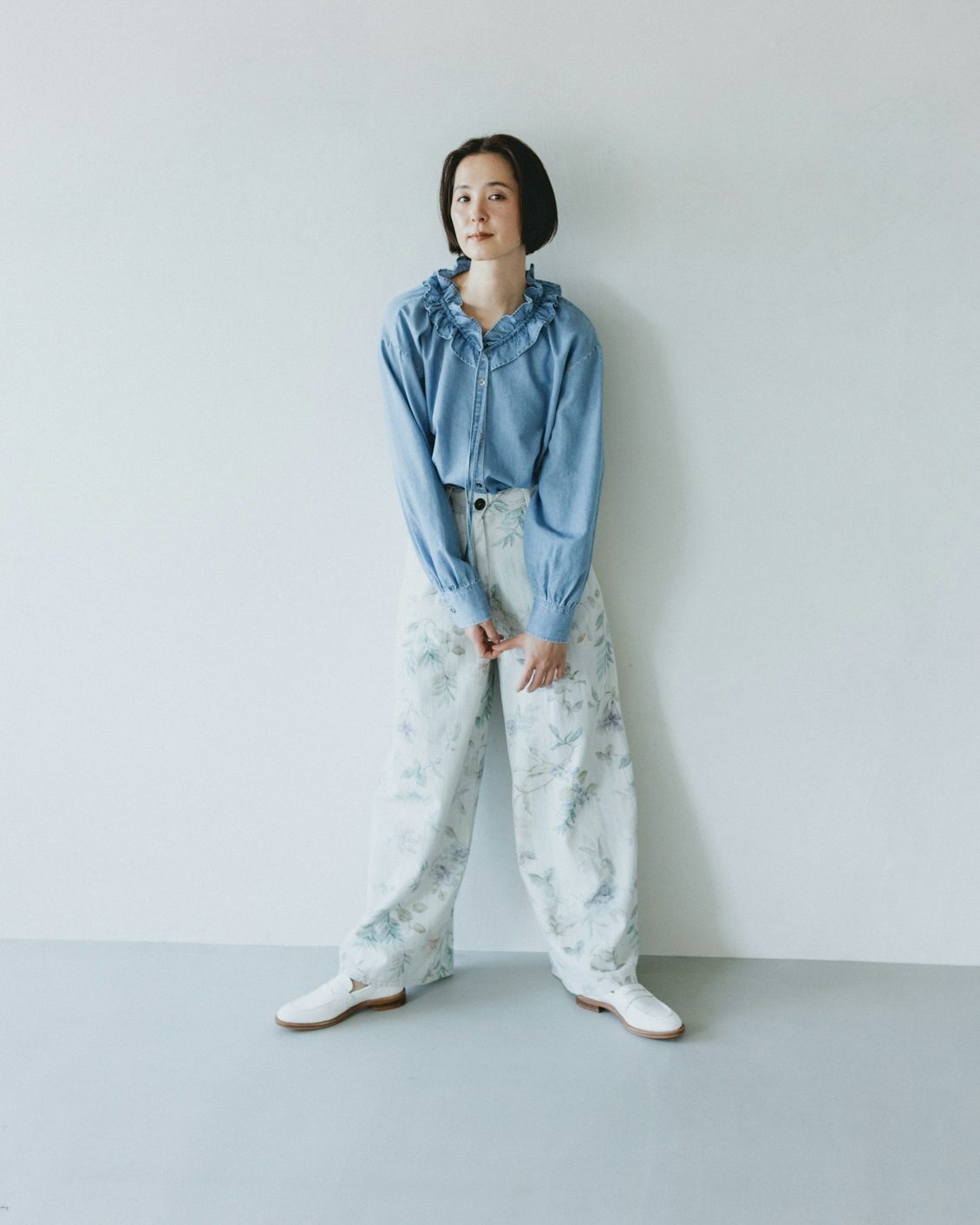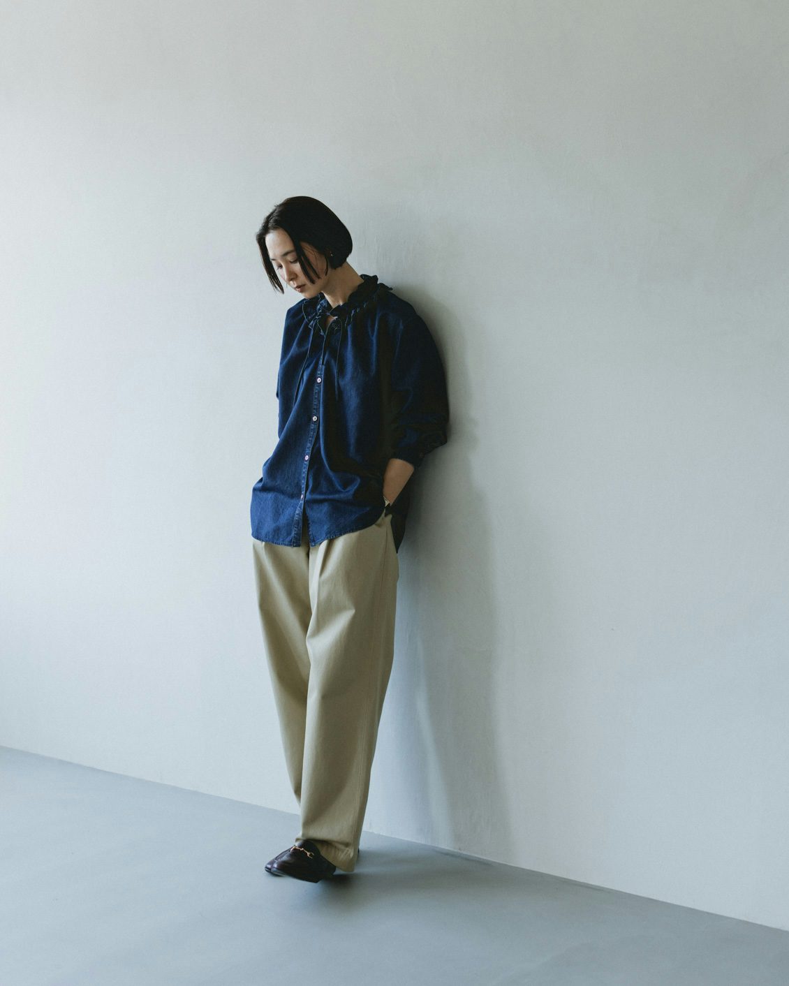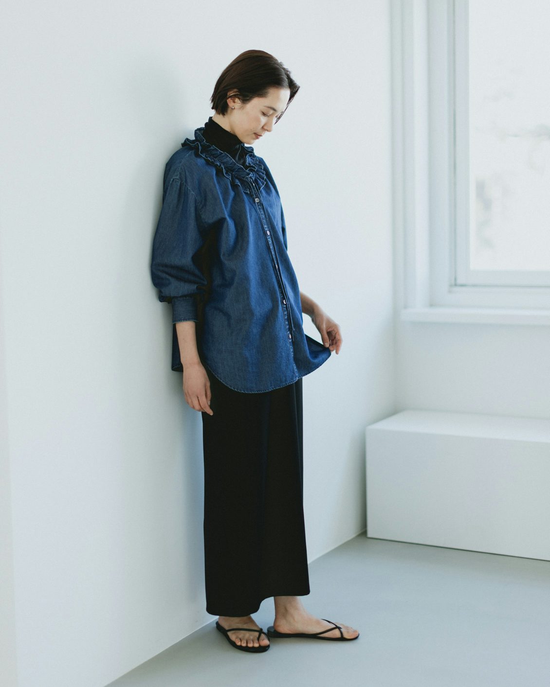 目指したのは、デニムのラフさとフリルの甘さが調和した、大人に似合うブラウスです。