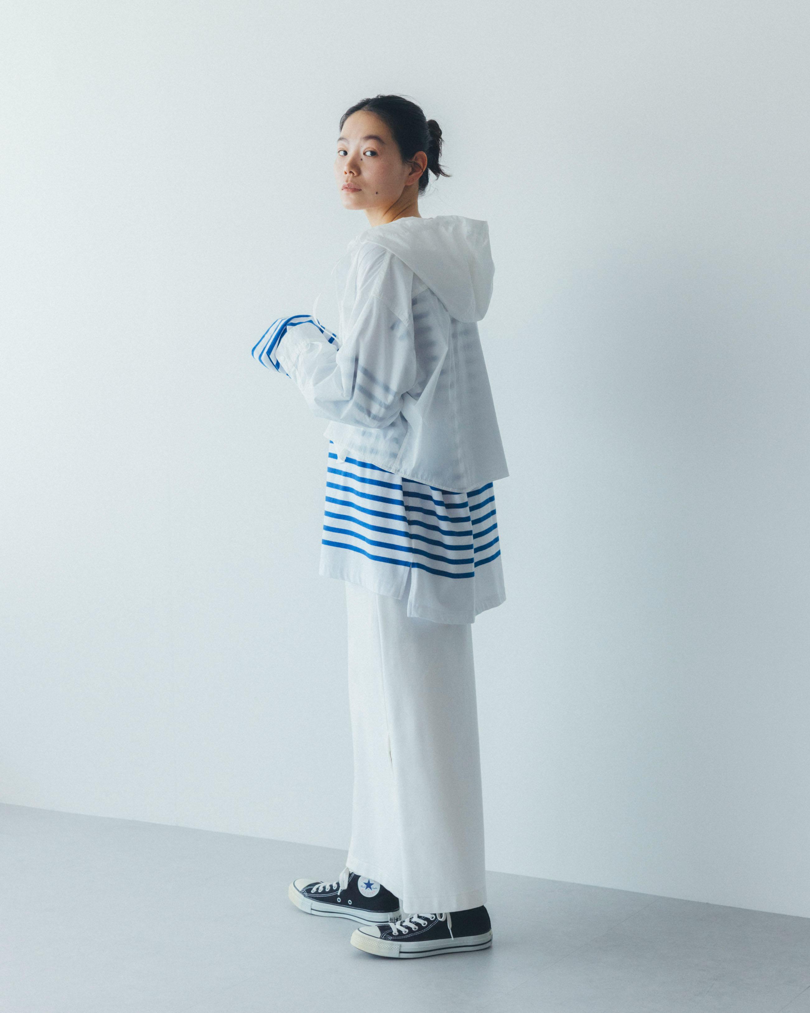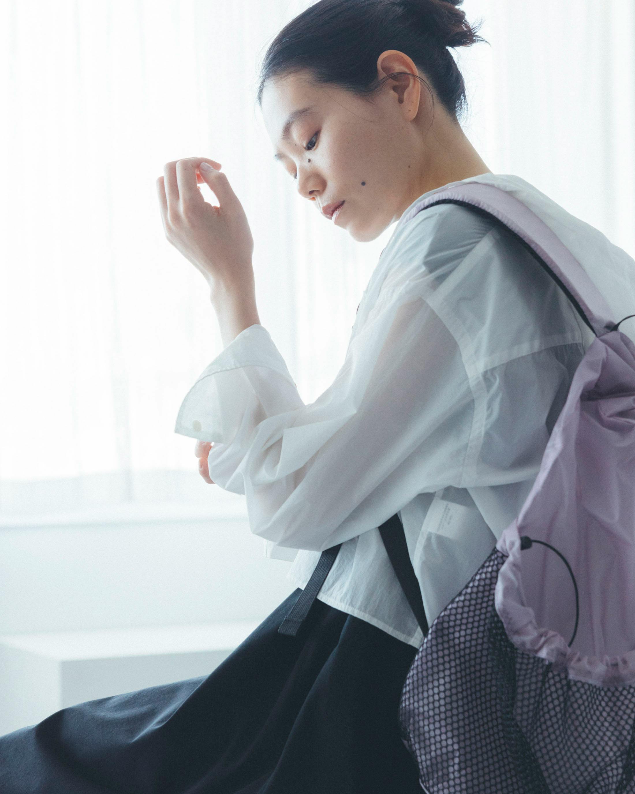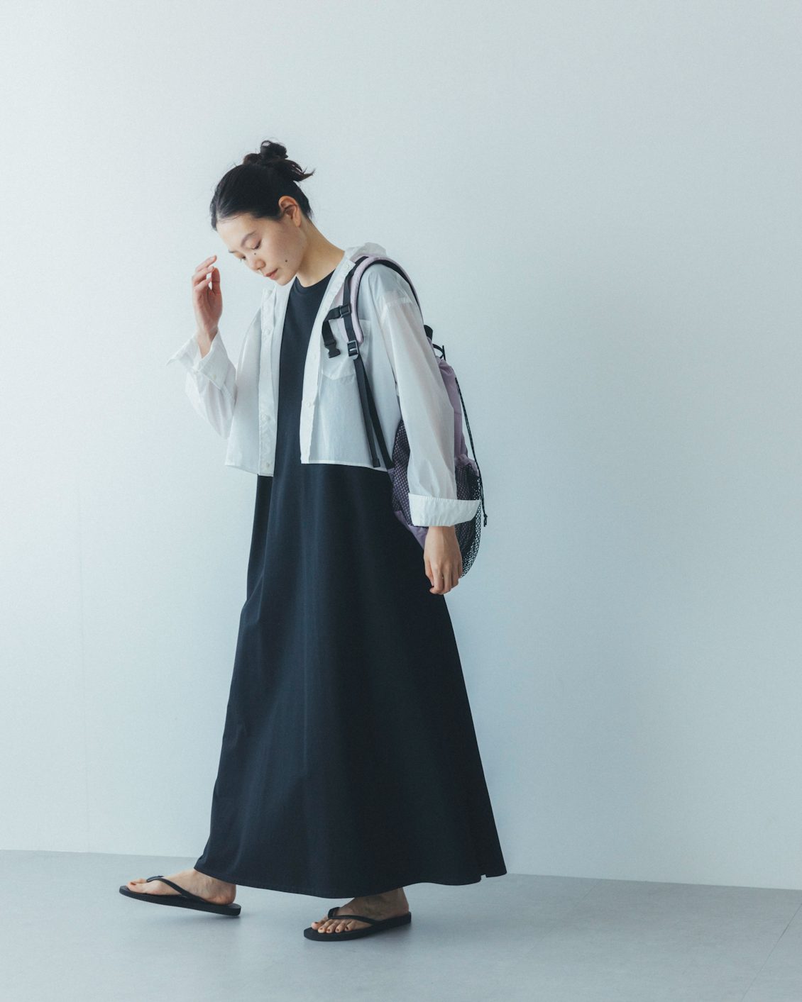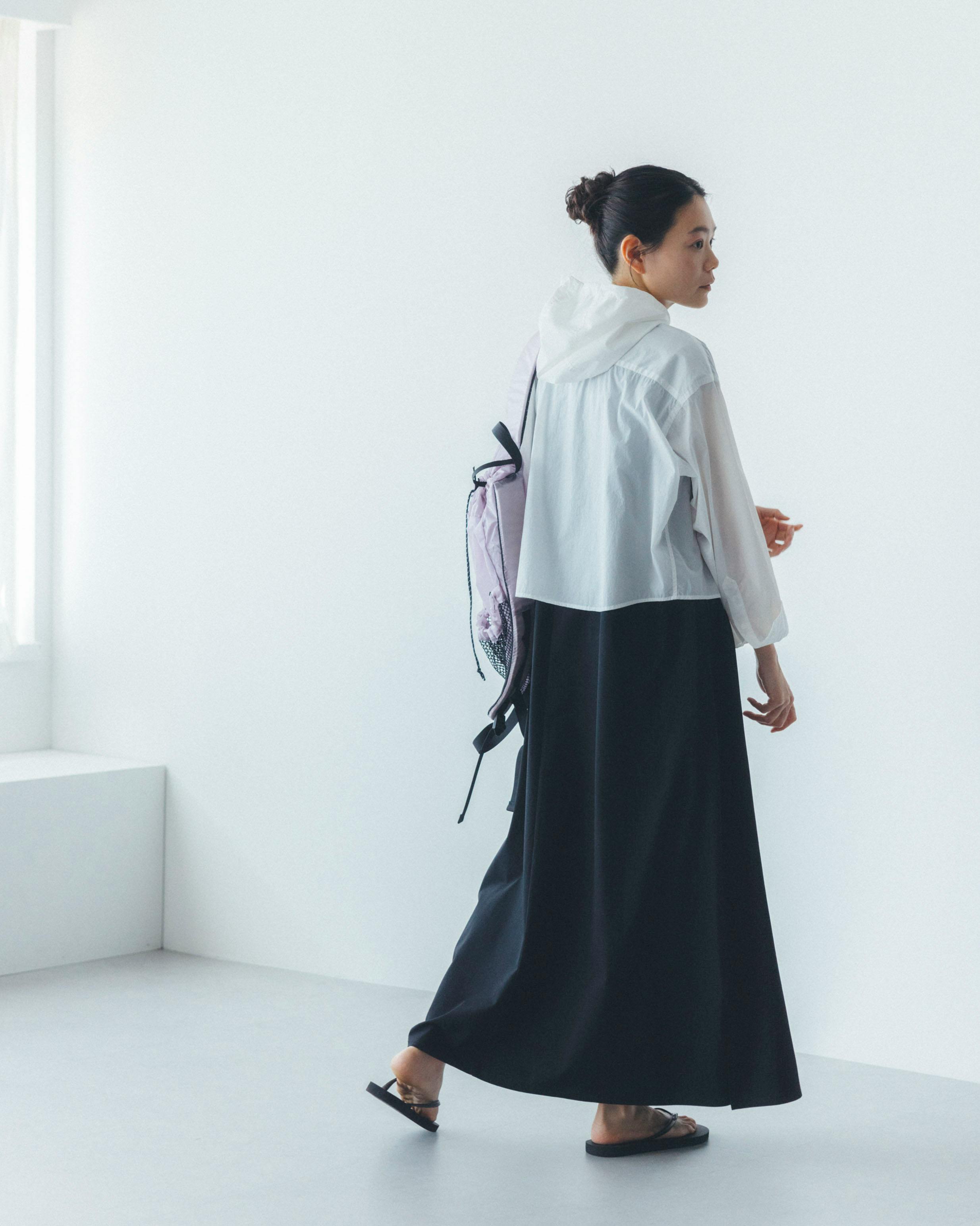 シルエットの軽やかさをさらに引き立てているのが、中に着たトップスがうっすらと透けるくらいのシアーな質感。