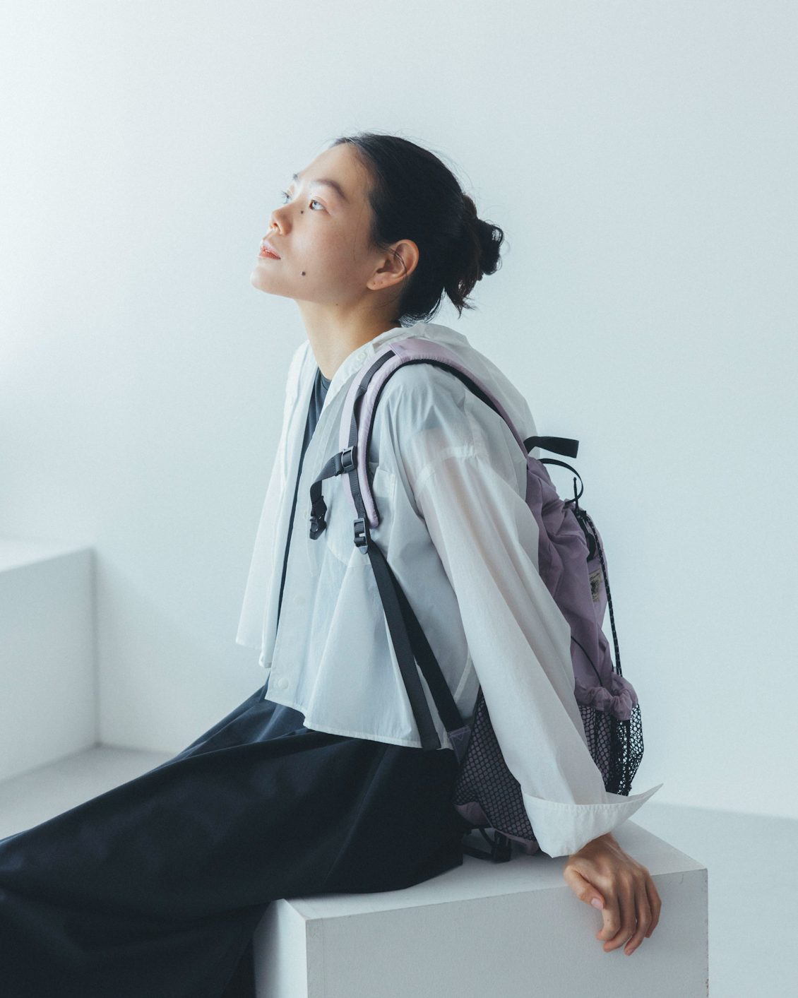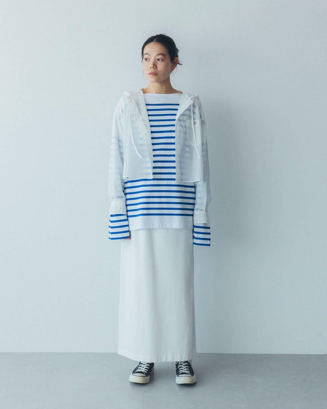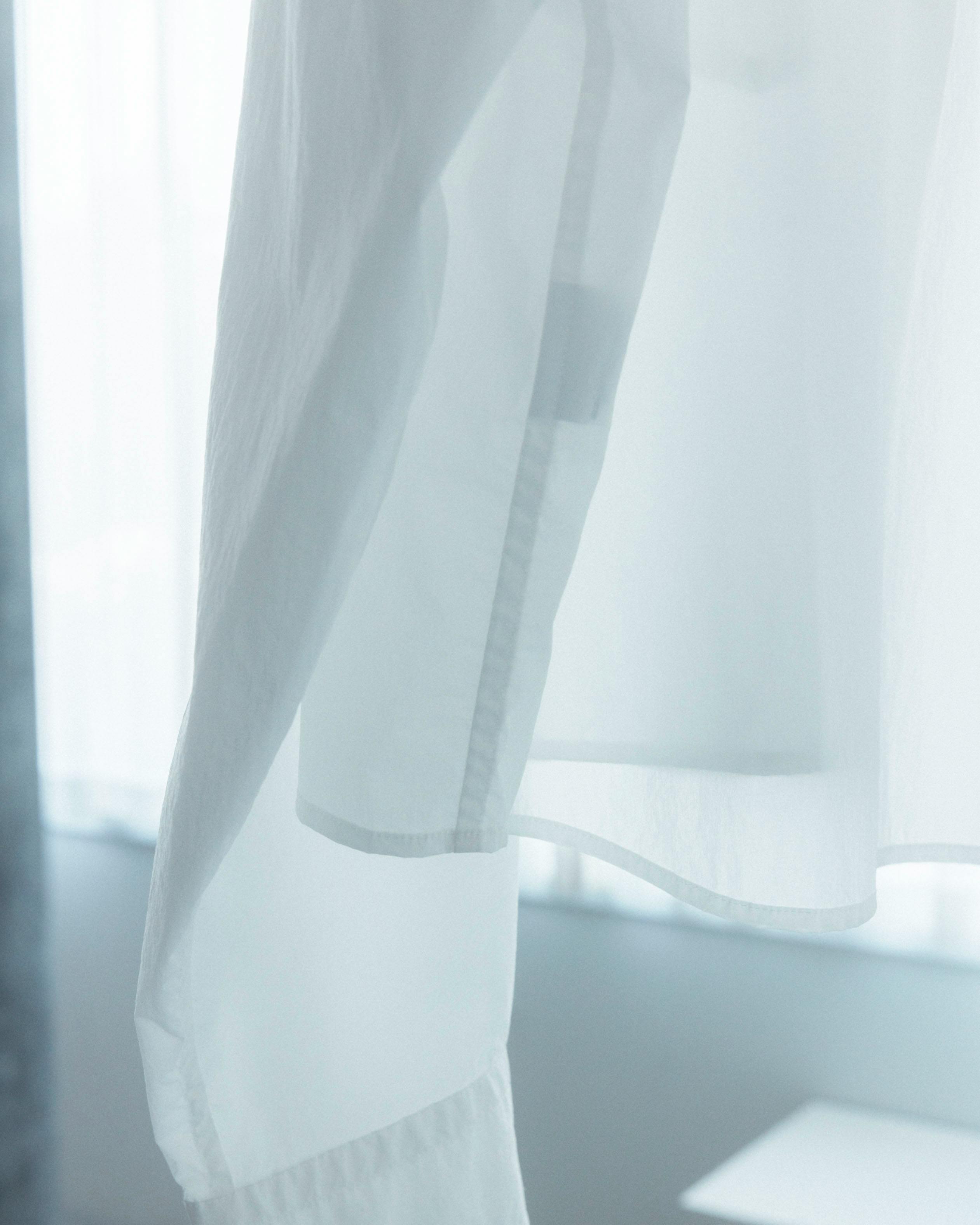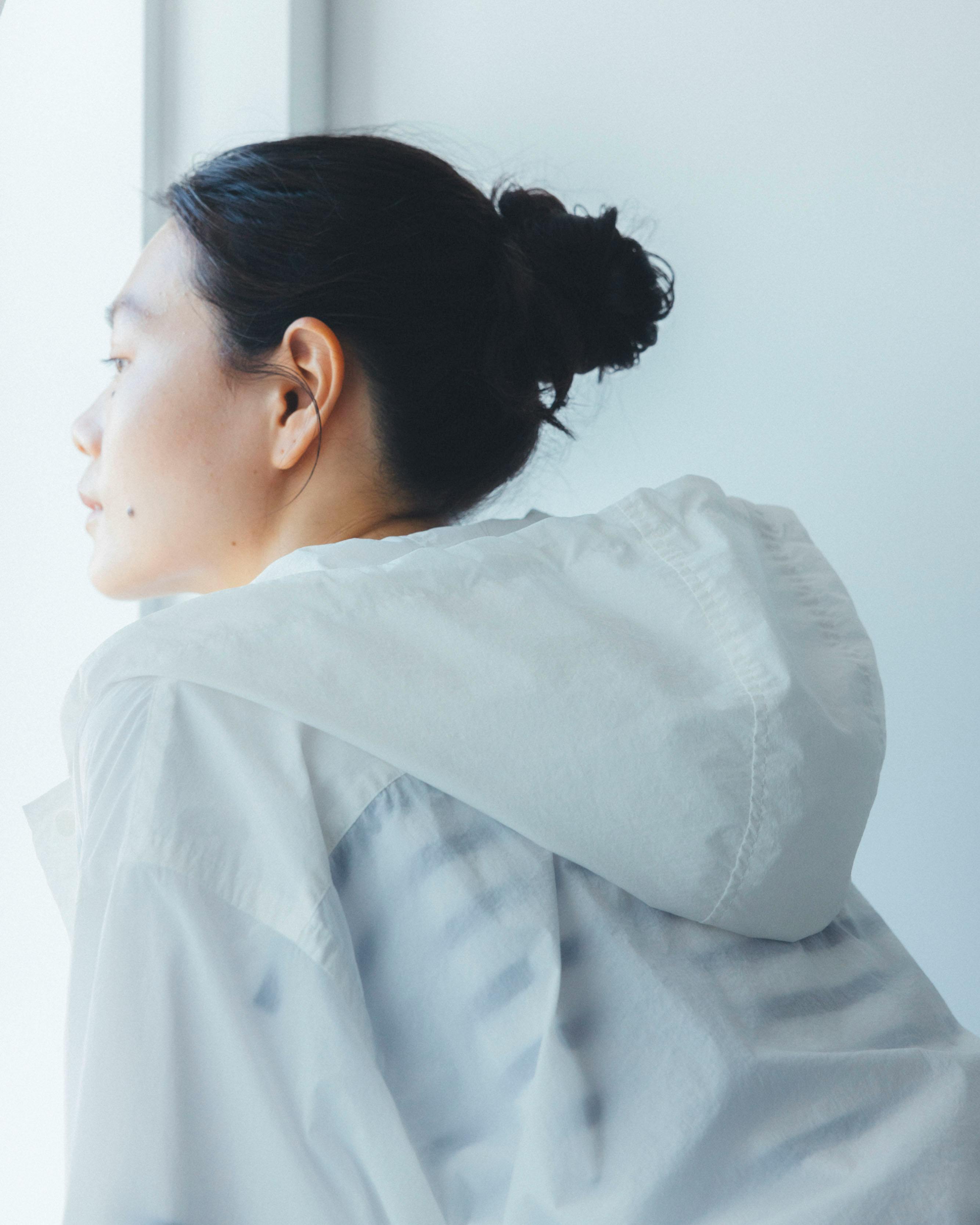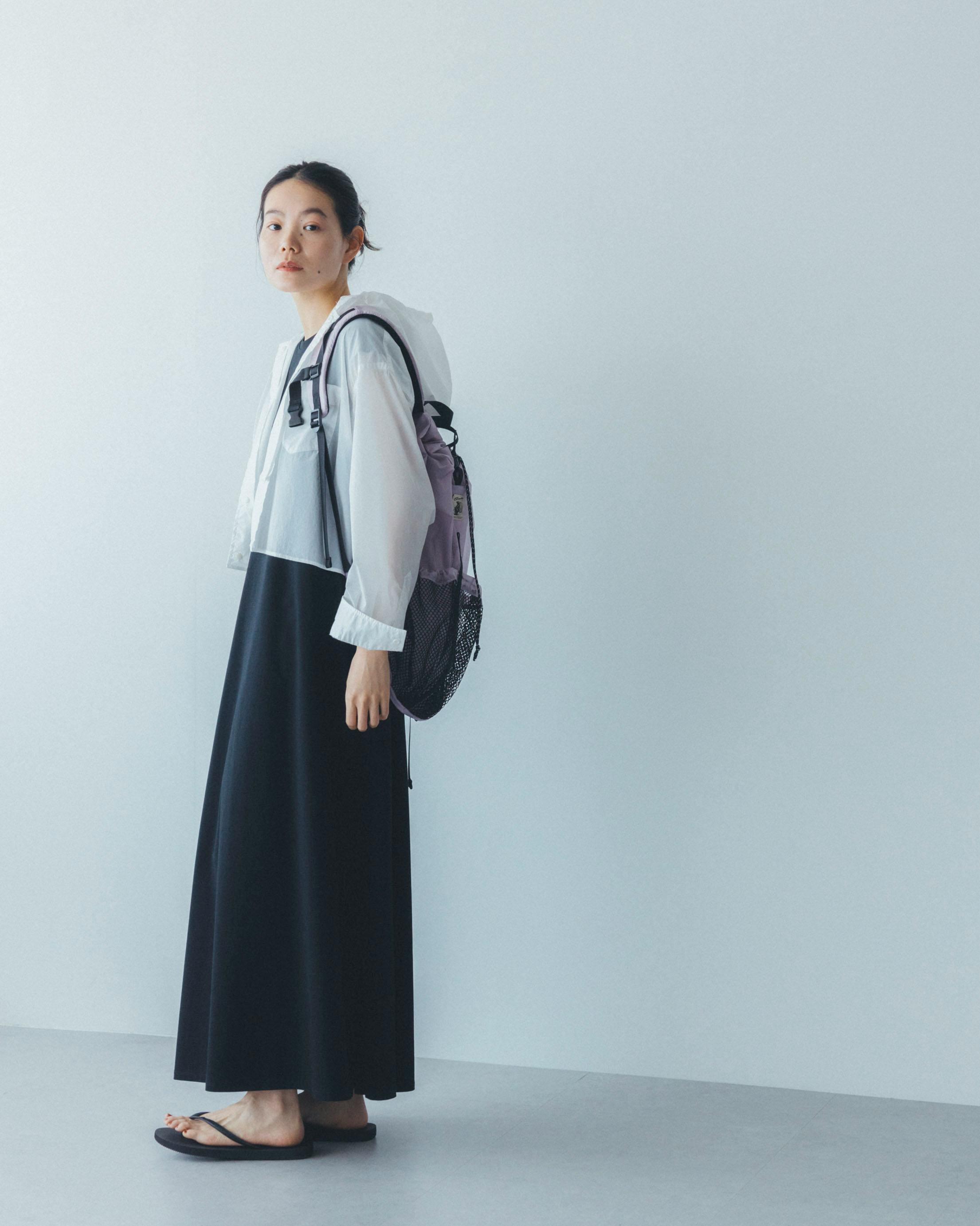 シルエットの軽やかさをさらに引き立てているのが、中に着たトップスがうっすらと透けるくらいのシアーな質感。