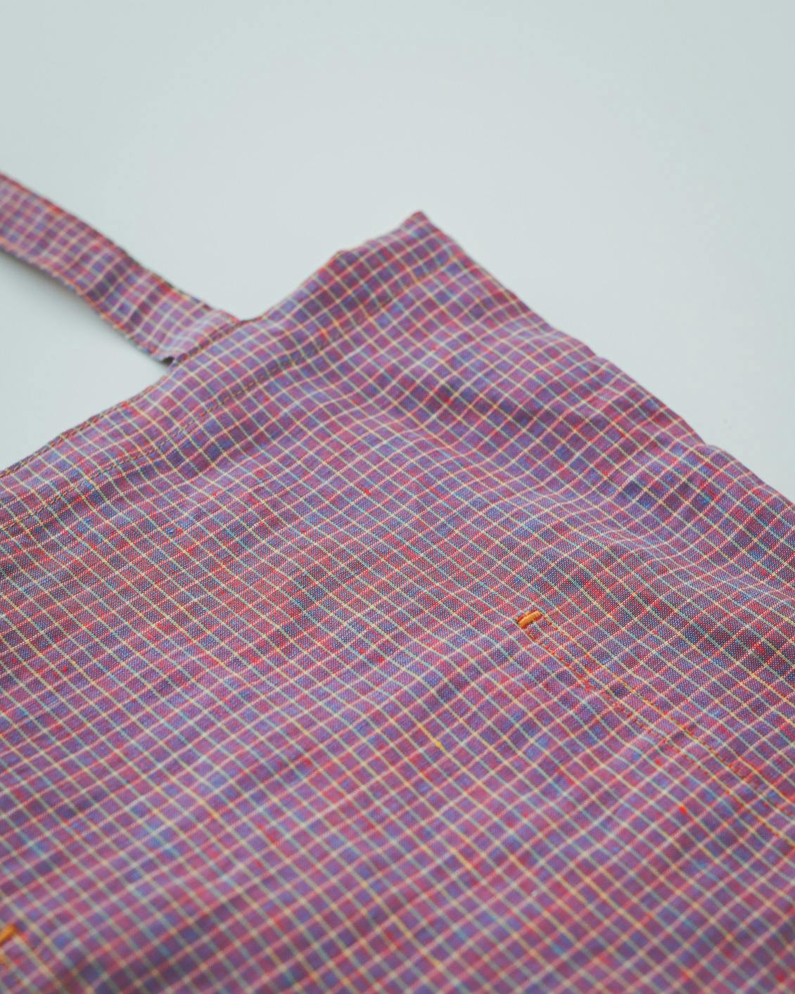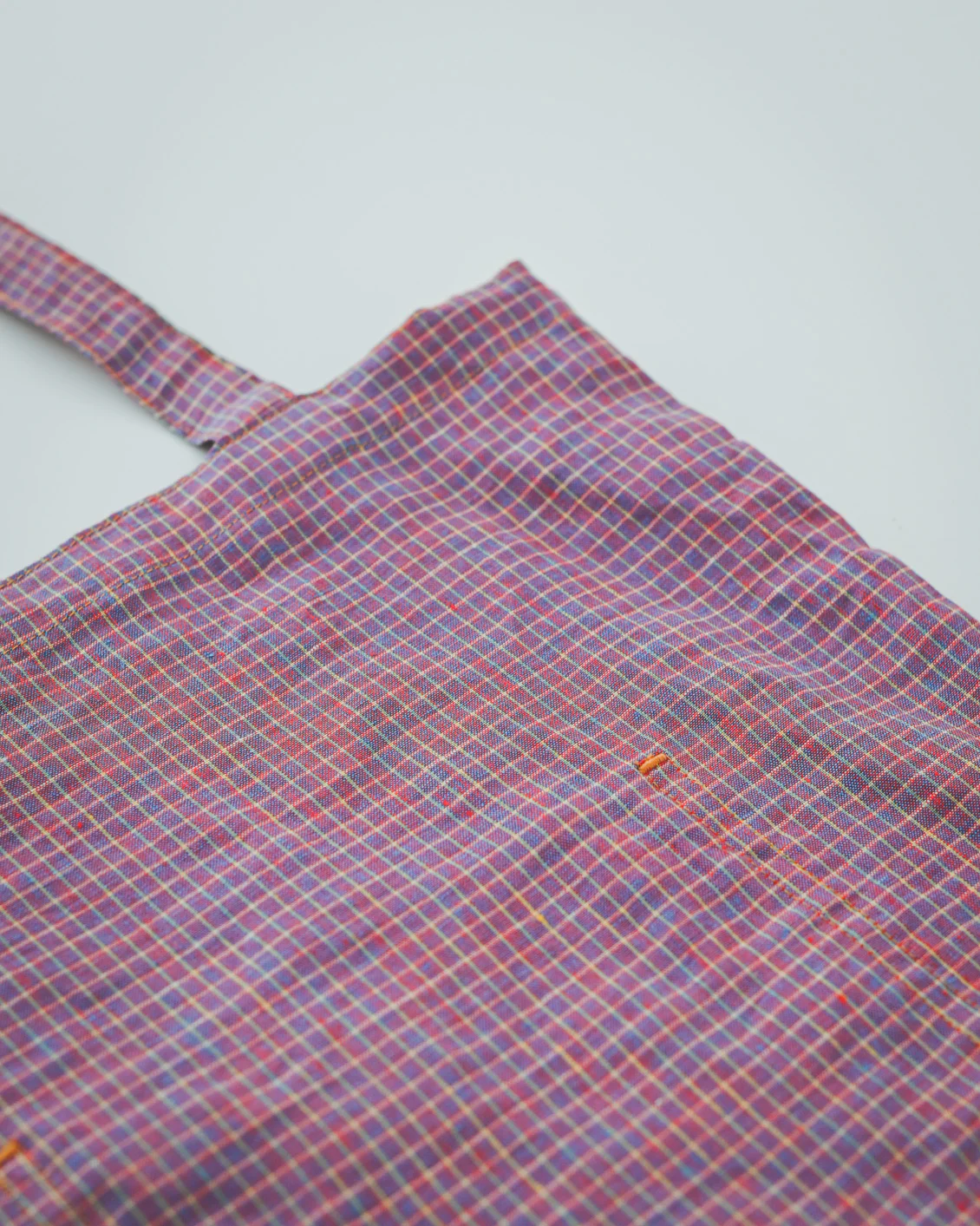 パッと目を引く、明るいオレンジのチェック柄。縁にはネイビーのステッチも施されています。