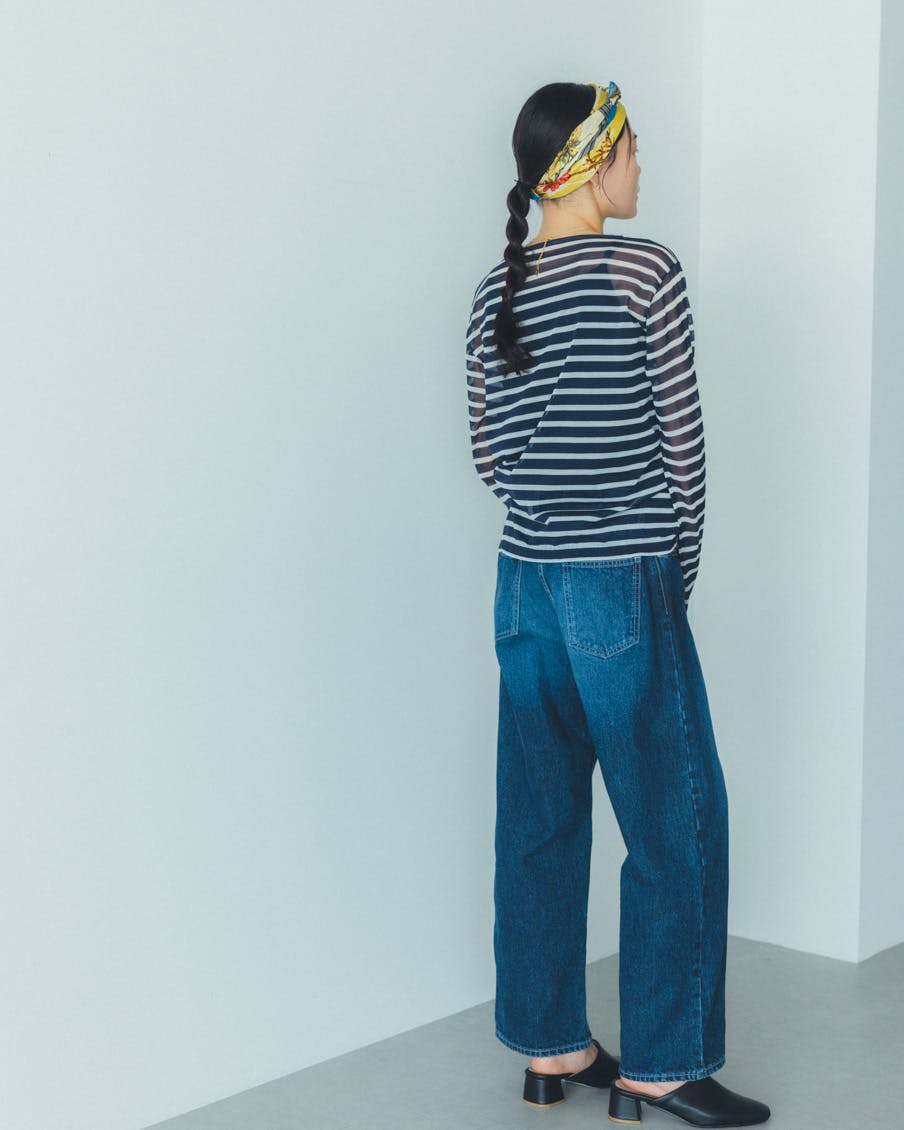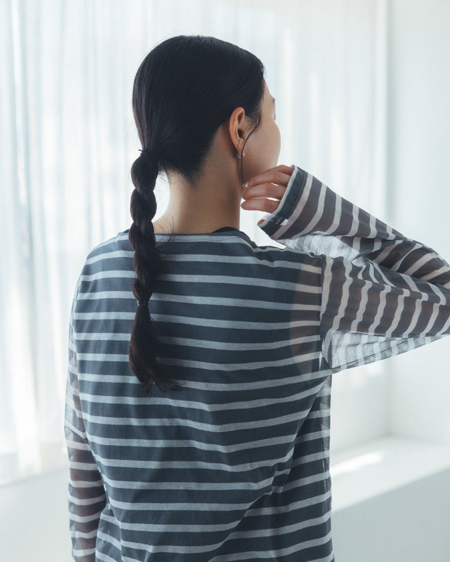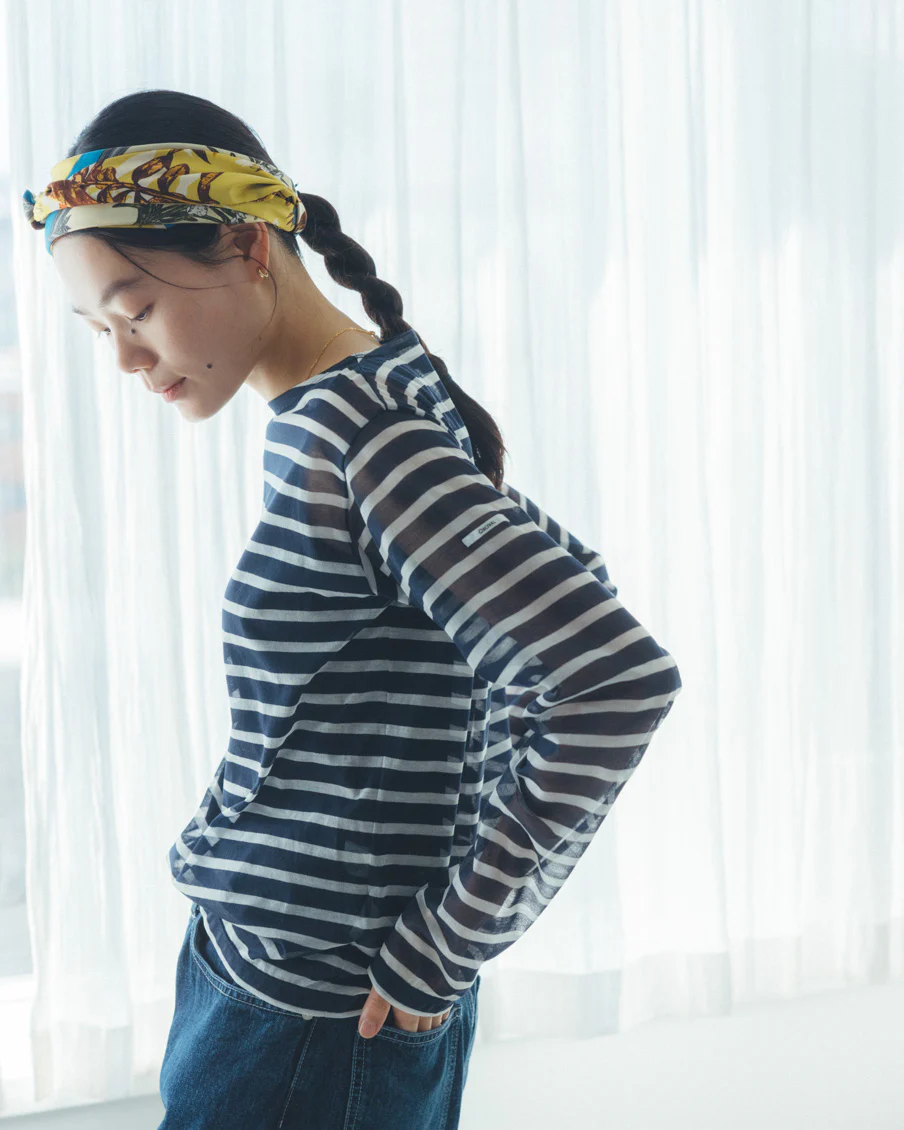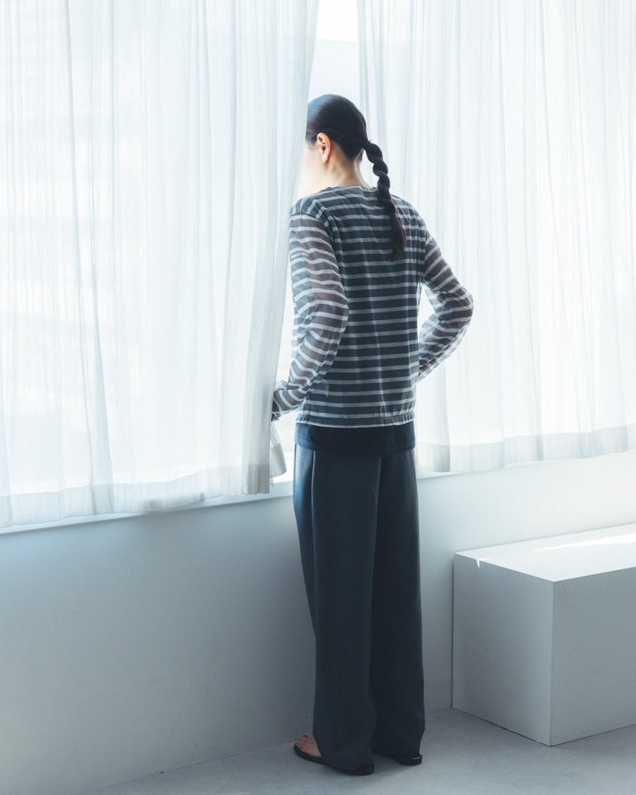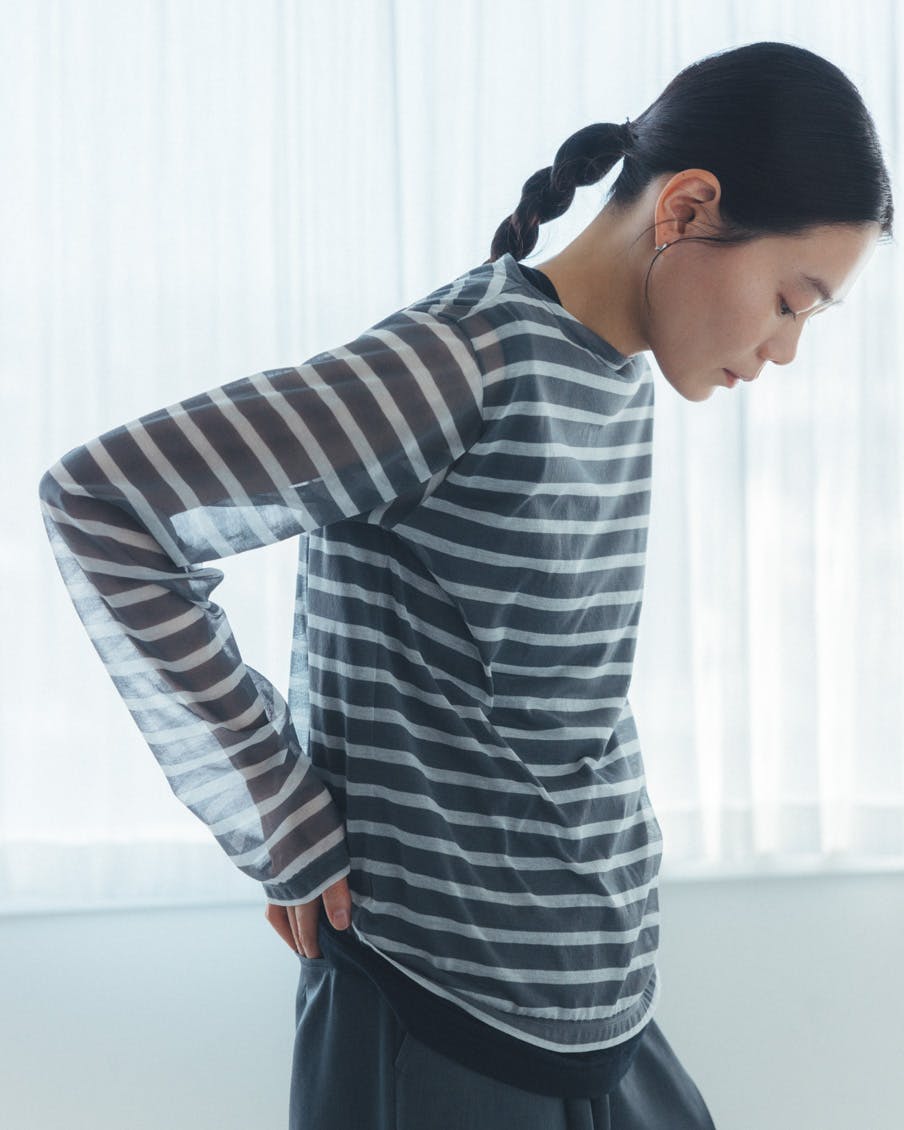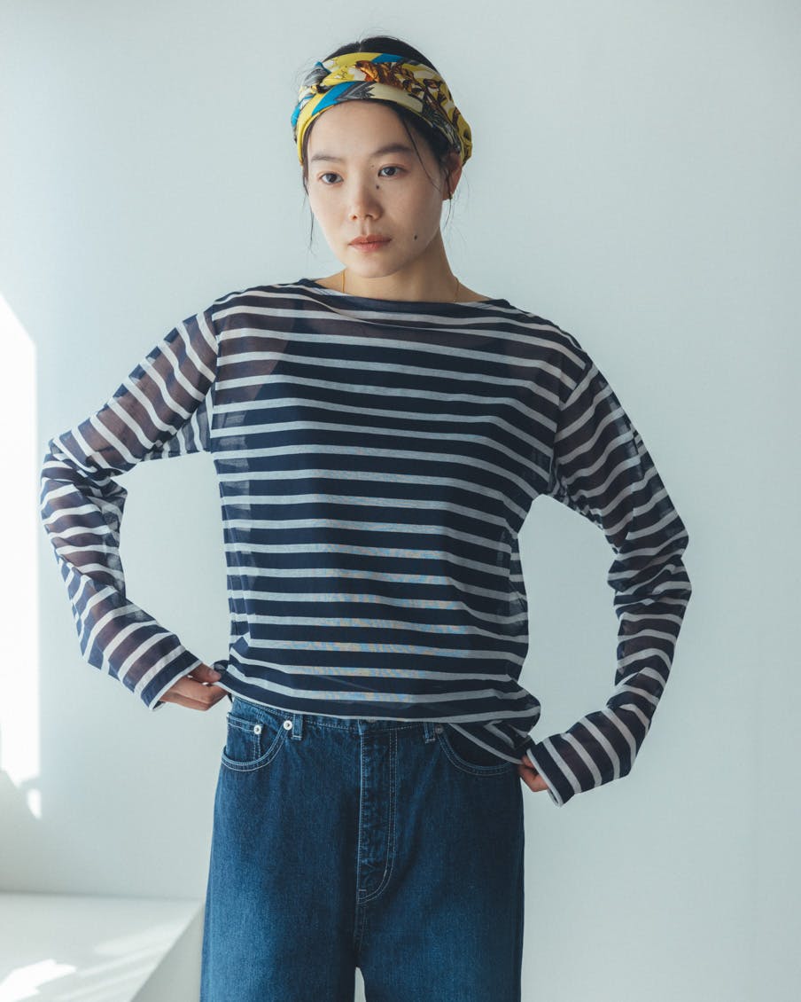 何に合わせても馴染み、着る人を選ばない、おおらかなボーダー。かぶるだけで抜け感が生まれ、大人っぽく、上品に映るシアー素材。