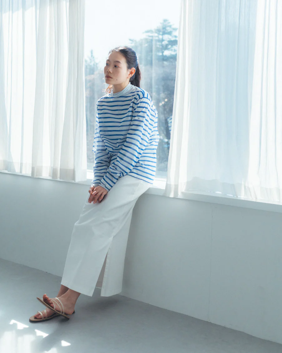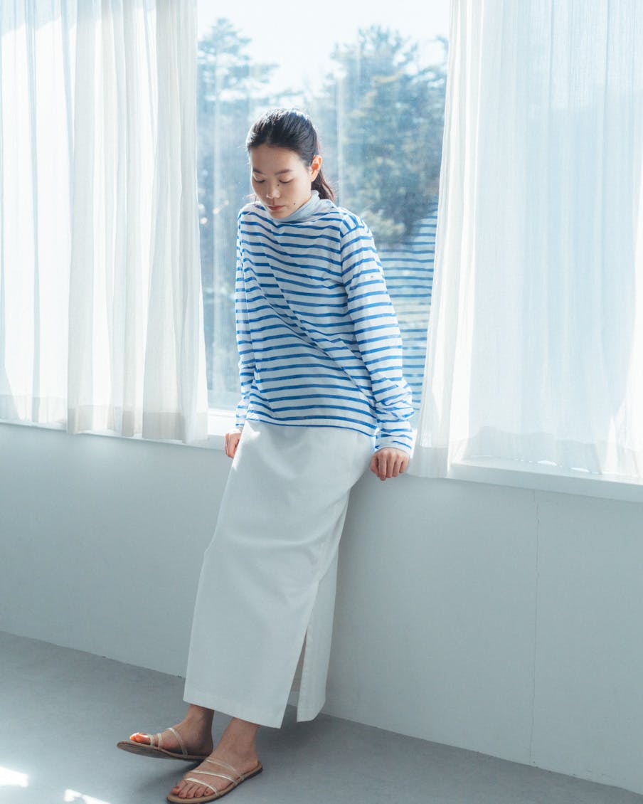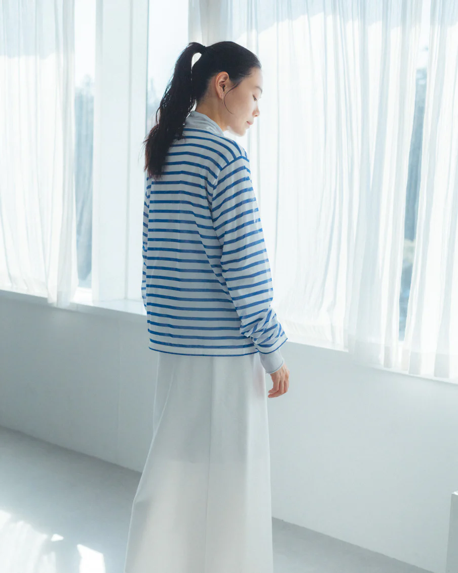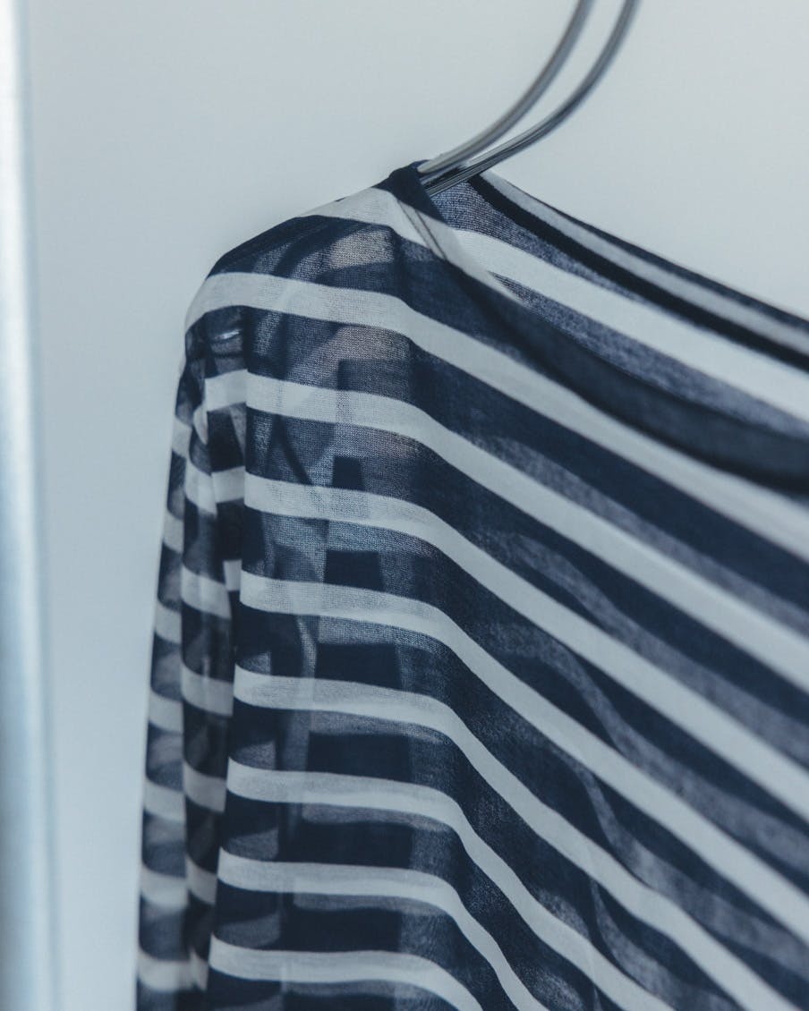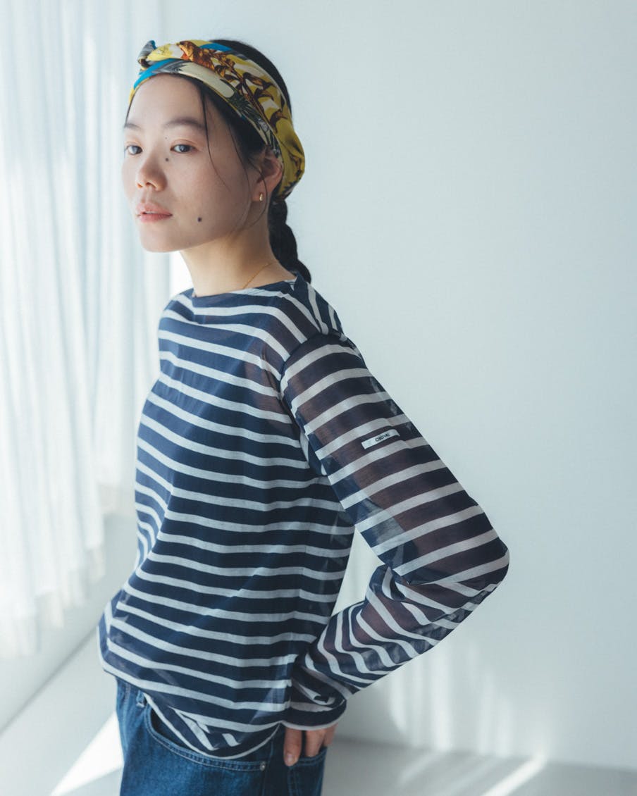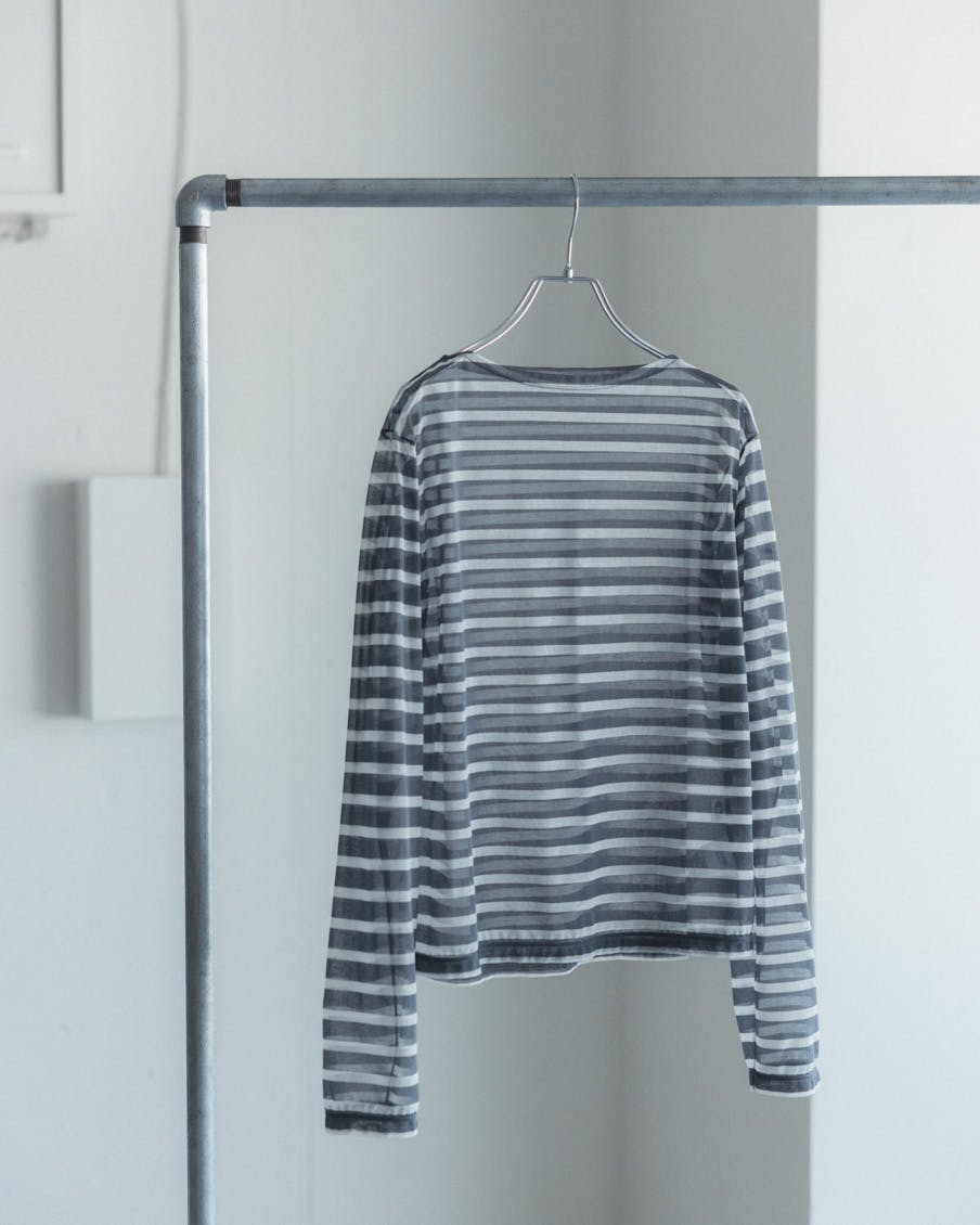 それでいて、シアー生地ならではの繊細さと、ドライな質感のおかげで、親近感のあるボーダーがひと味違う。