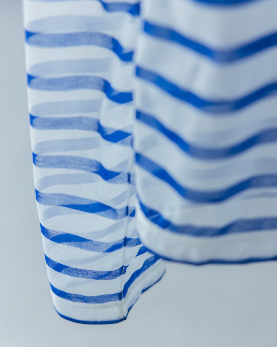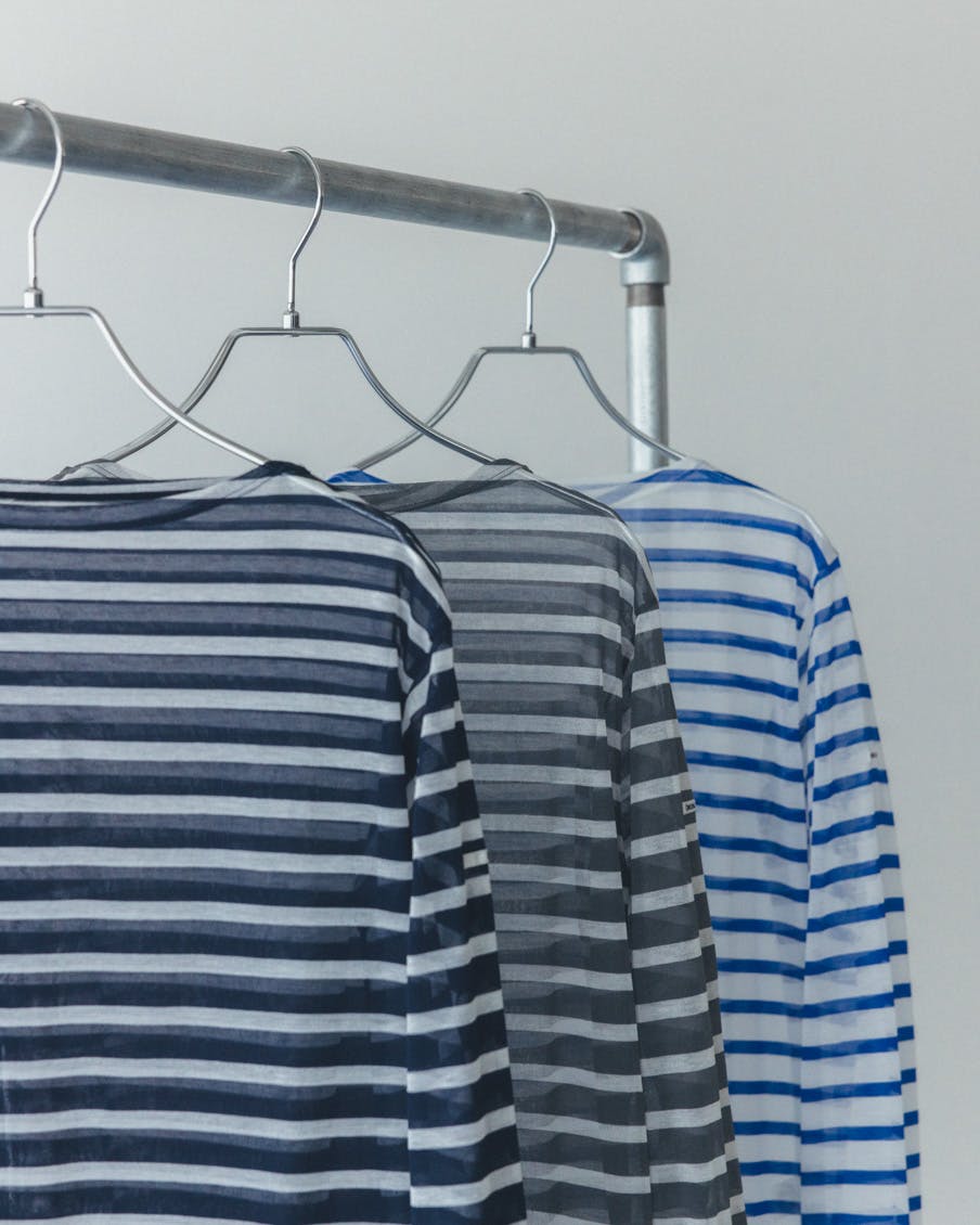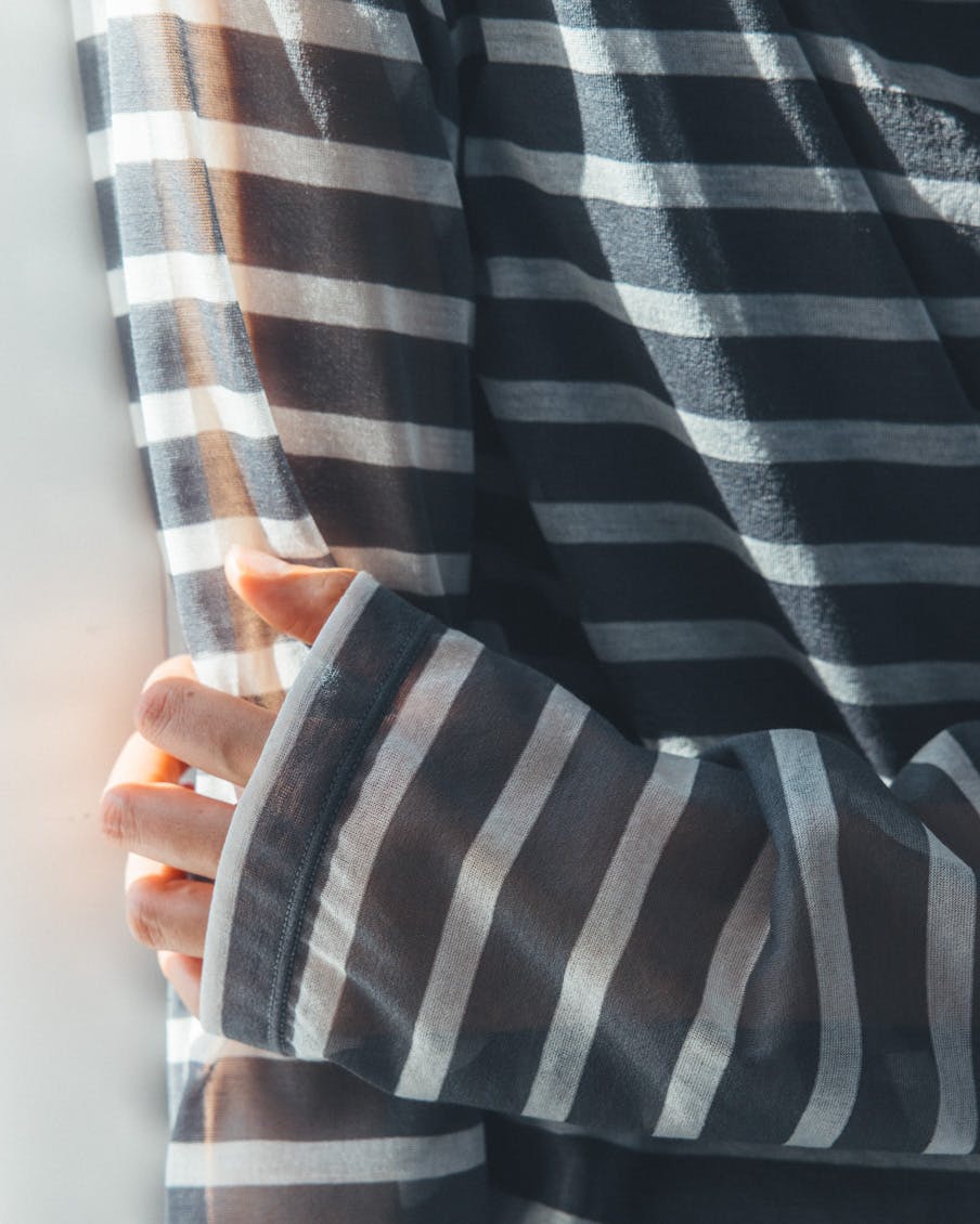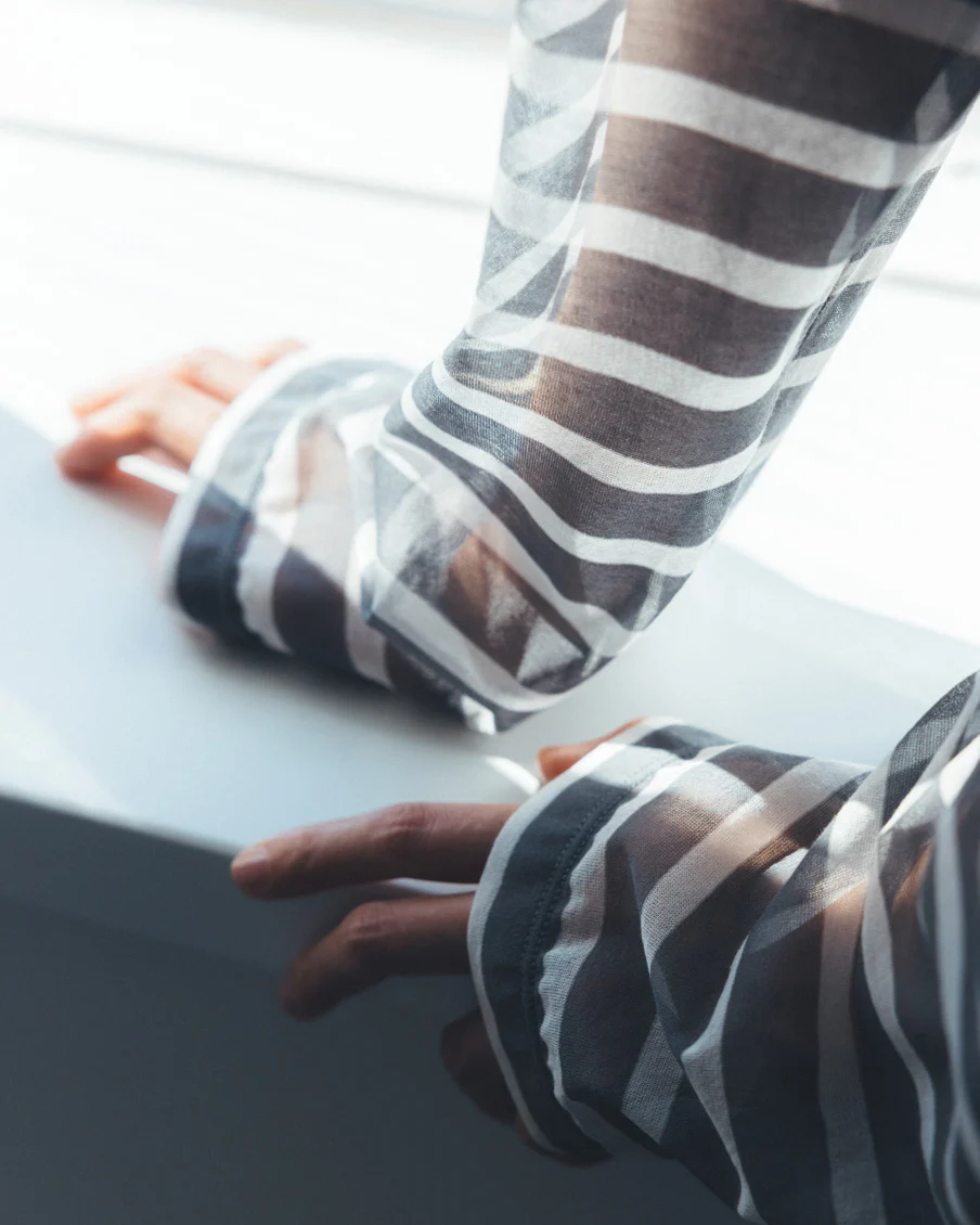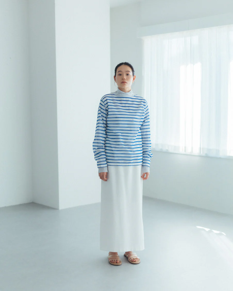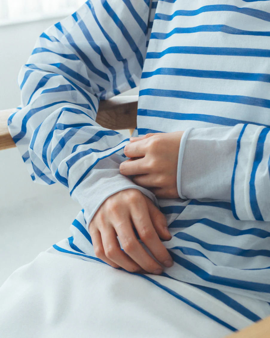 それでいて、シアー生地ならではの繊細さと、ドライな質感のおかげで、親近感のあるボーダーがひと味違う。