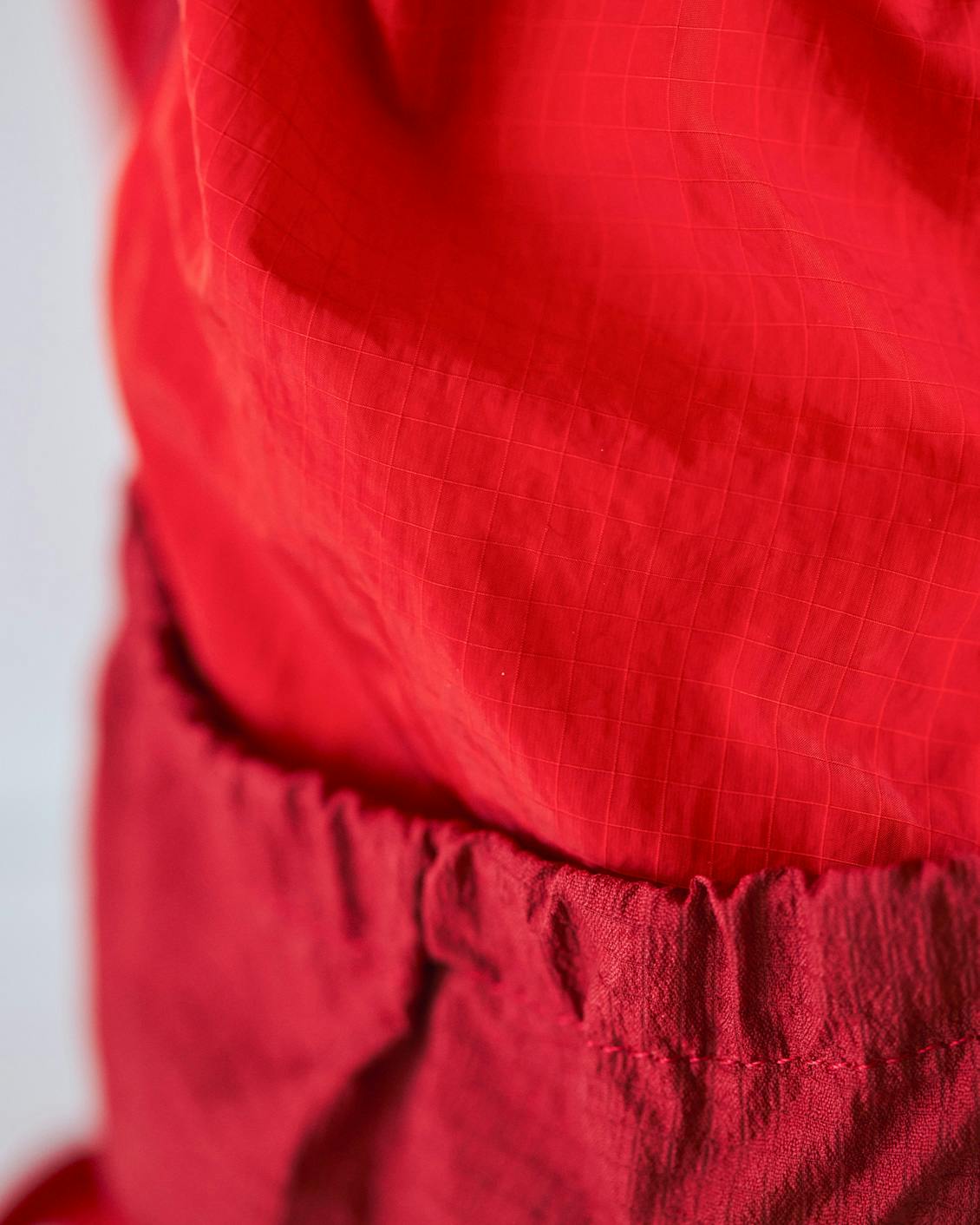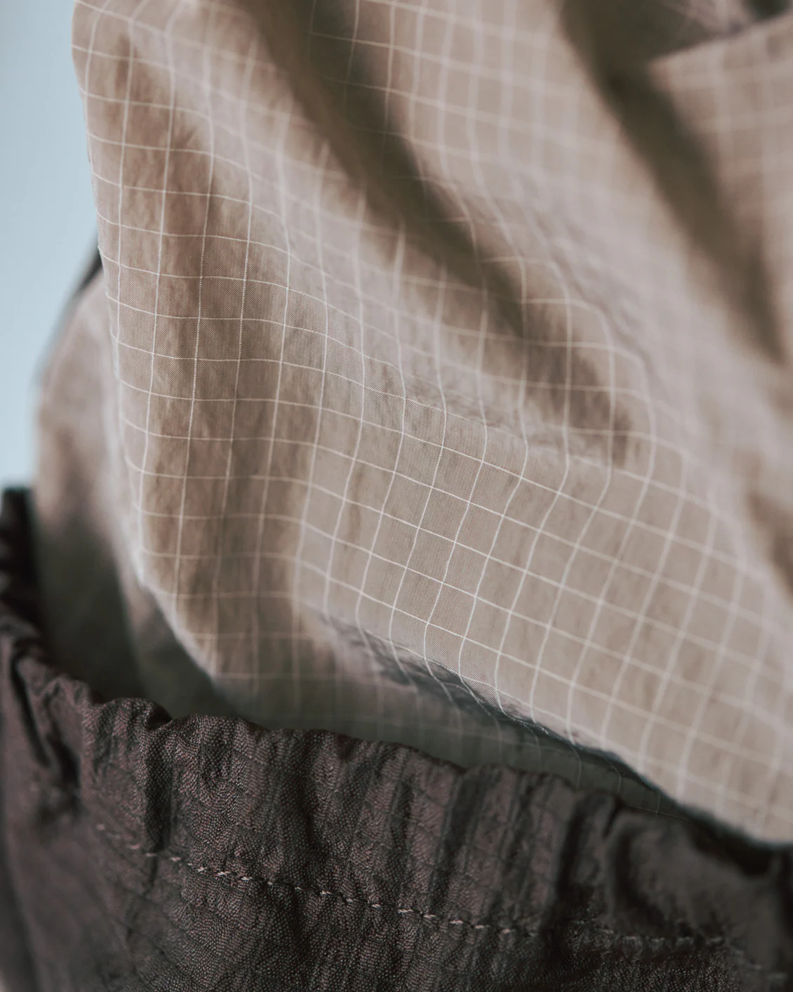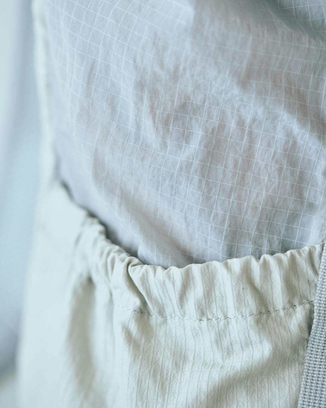 格子の地模様がポイントの「リップストップ生地」。もともとは本格的なアウトドア用品にも使われるタフな素材で、格子状に織り込むことで、ほつれや裂けを防ぎ、とっても軽くて丈夫なんです。