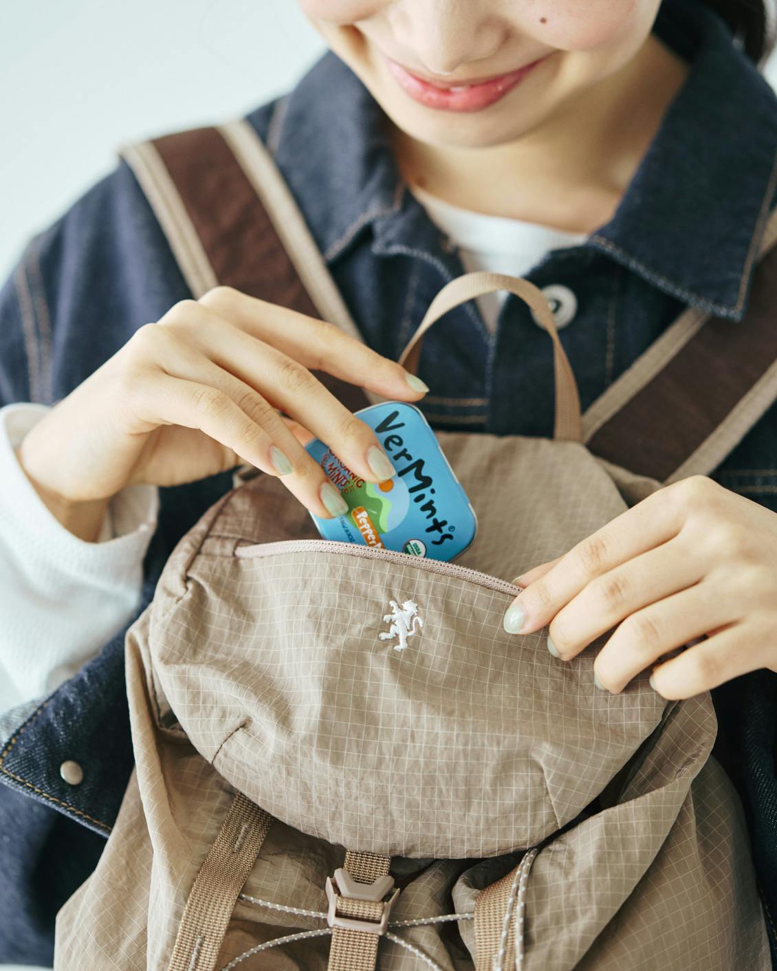 特徴的なのは、リュックの開口部にある「フラップポケット」。リップやイヤホン、目薬などすぐに取り出したいものをいれて、小さなポーチのように使えます。
