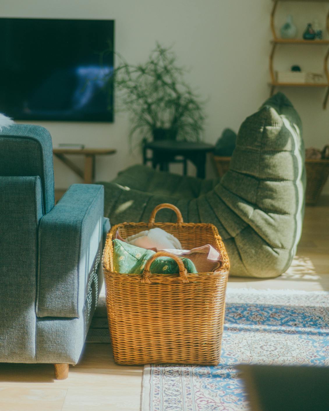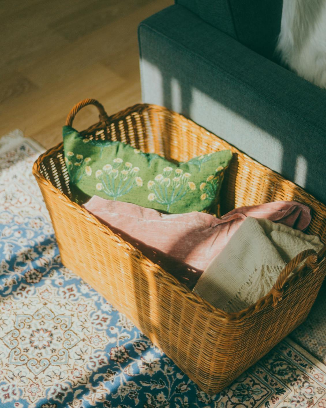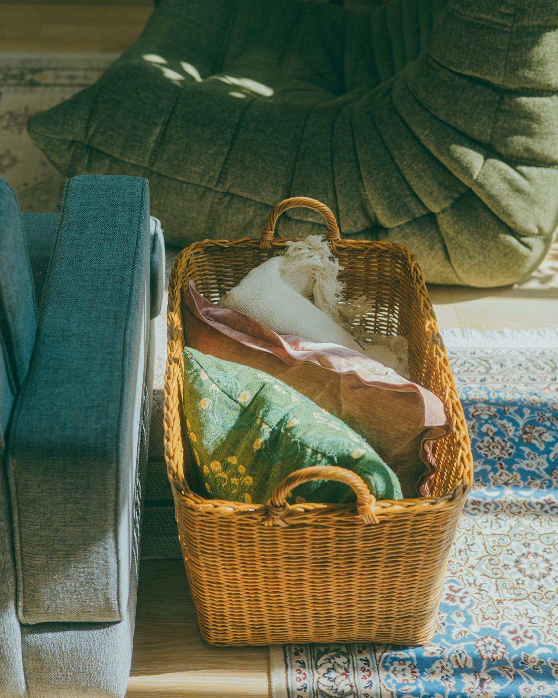 ソファの横に置いてクッションやブランケットを入れたり、子どものおもちゃの目隠しにしたり、ウォークインクローゼットやパントリーの収納にしたり。実はとっても使い勝手がいいんです。