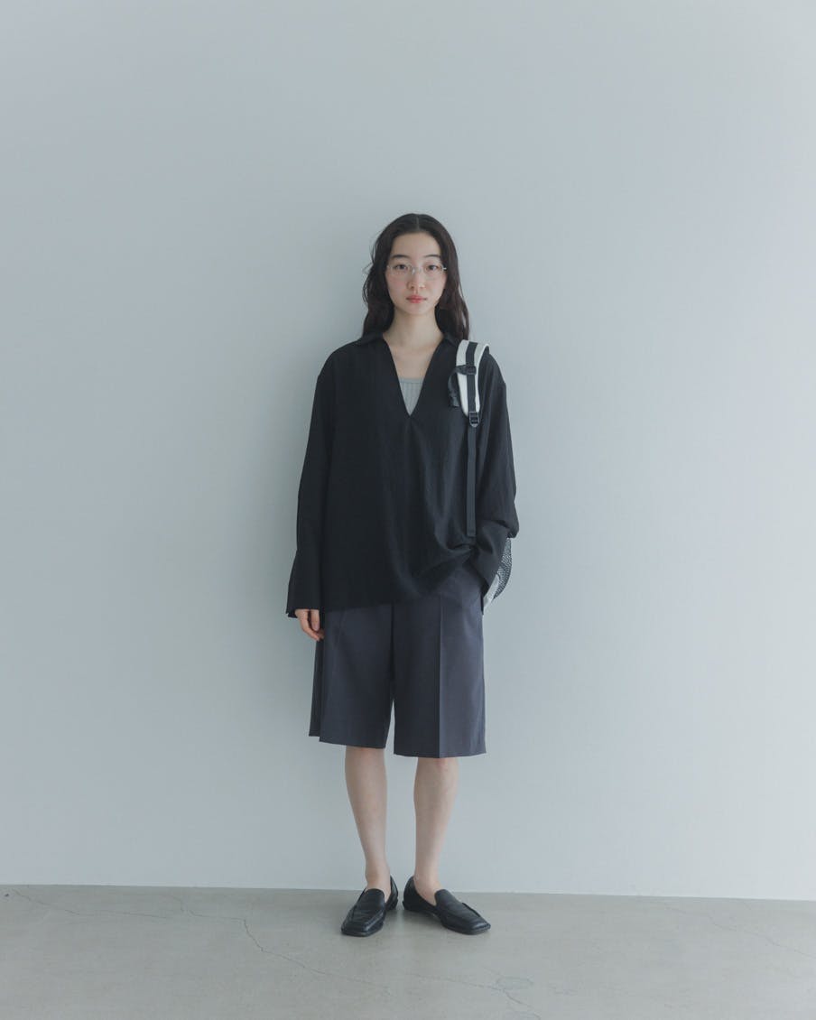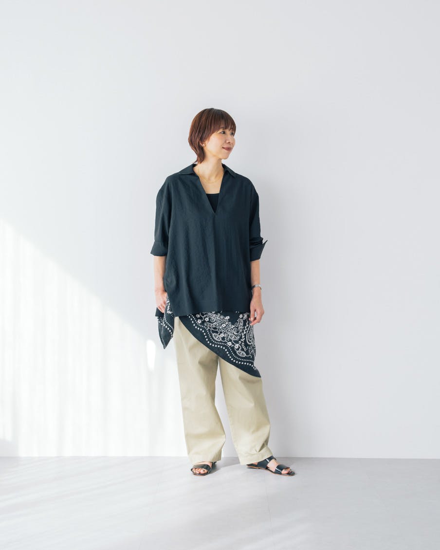 アクセントにしたのは、潔いVネック。顔まわりがすっきり映る、スキッパータイプのブラウスにしました。