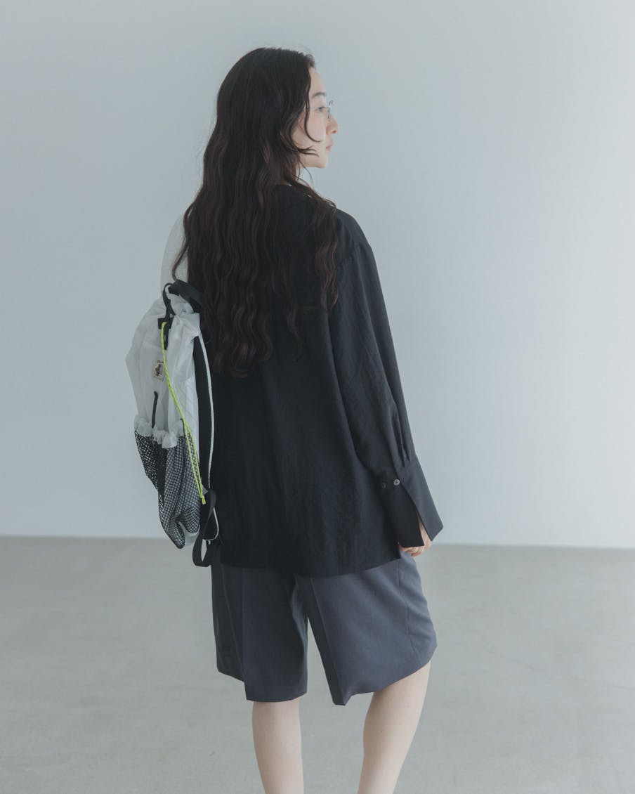 ポリエステル100%の生地は、とろとろと手からこぼれるような柔らかさが特徴。マットで程よいシワ感があり、デイリーに着やすい上品さです。