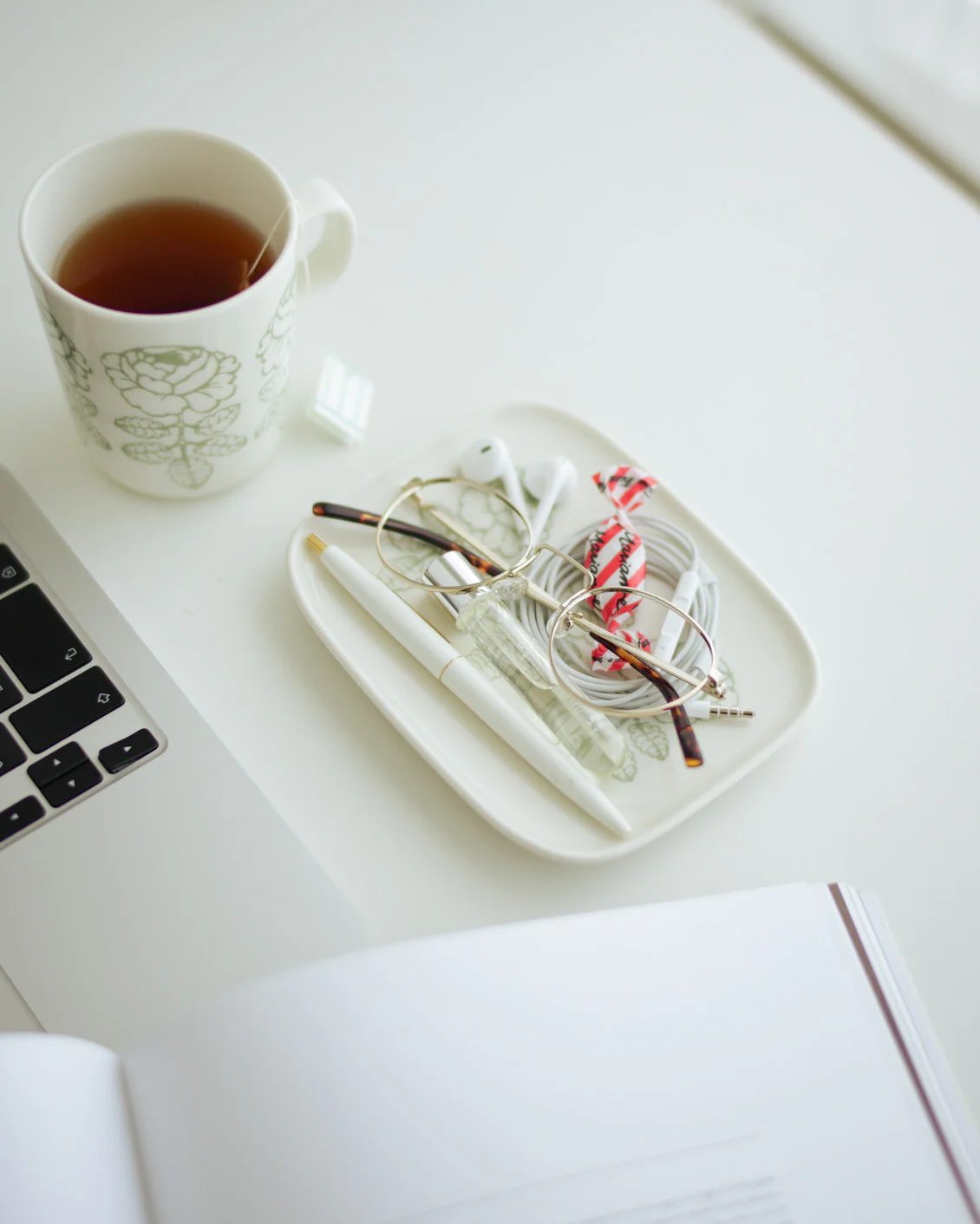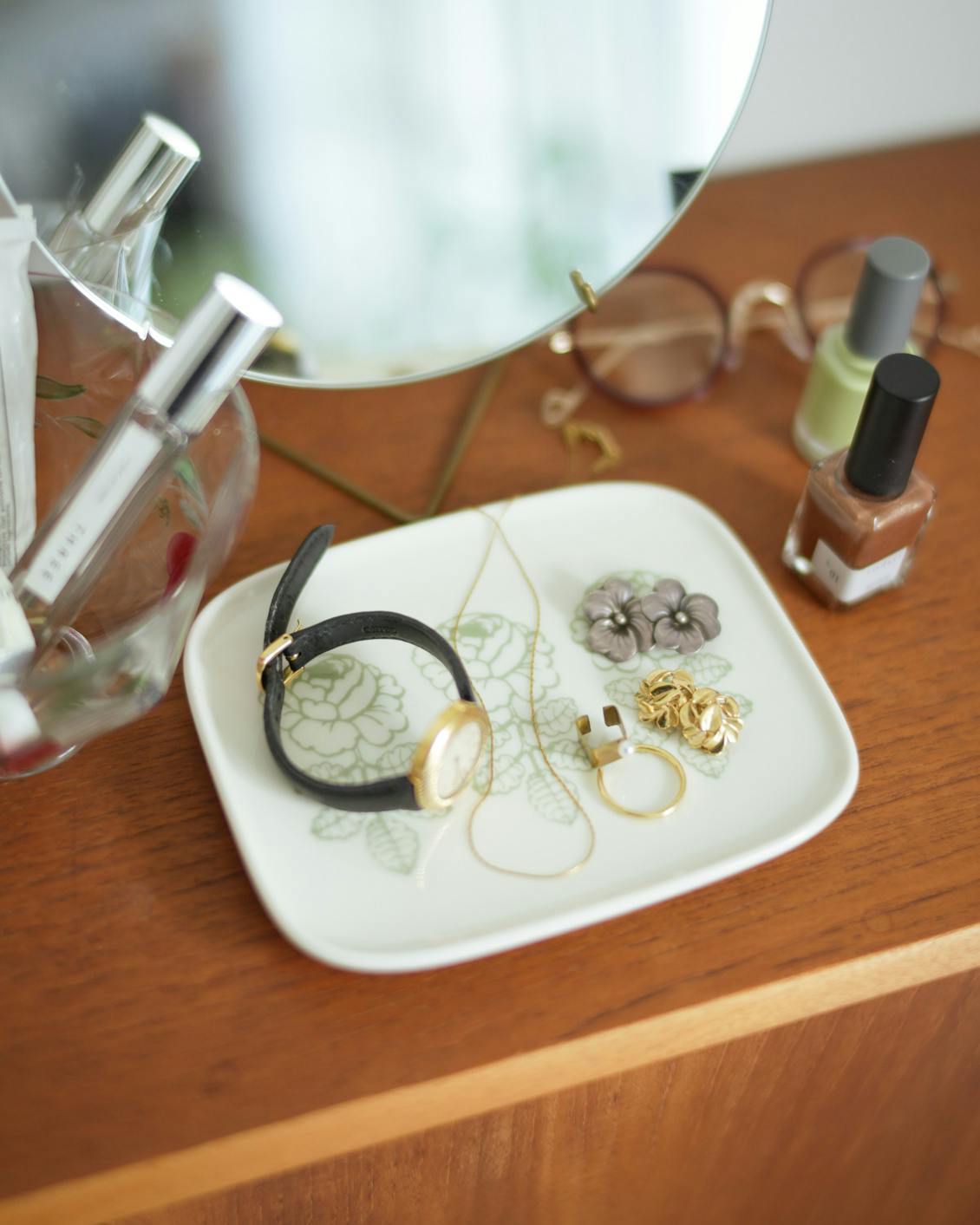 例えば、アクセサリーの定位置として。フチに立ち上がりがあるので、小さなピアスやリングも安心して置けますよ。