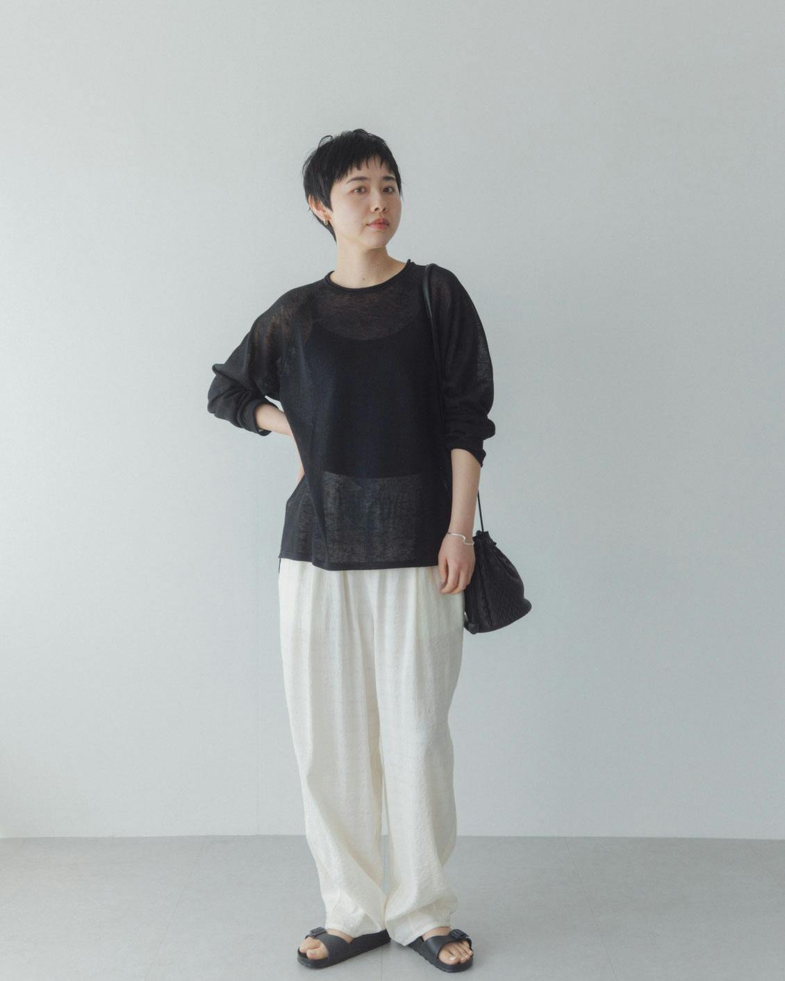 体のラインははっきりとは見えづらく、キャミソール合わせでもヘルシーな印象で着られます。