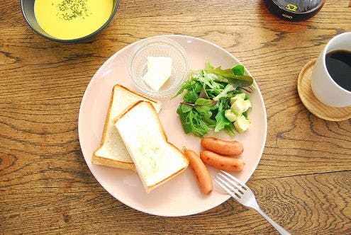 朝食時にはマグカップと共にトーストやフルーツを盛り付けたり