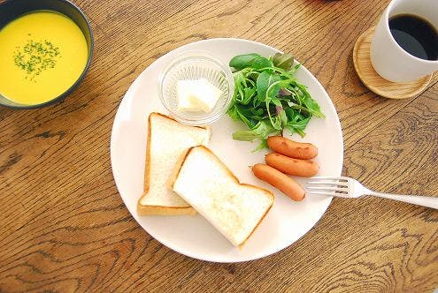 朝食時にはマグカップと共にトーストやフルーツを盛り付けたり