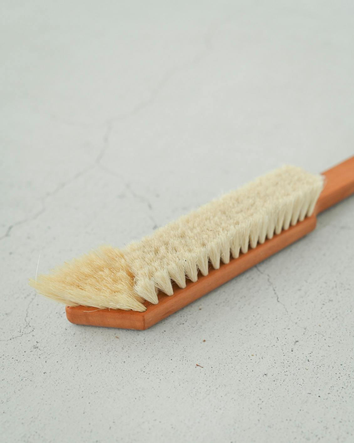 | お手入れ方法 | 通常の汚れはブラシを振り払いゴミを落とします。また、他のブラシやくしを使用し内部に入ったゴミを取ります。 山羊毛部分は、水洗いすると毛が絡まる恐れがありますのでおやめ下さい。 |
