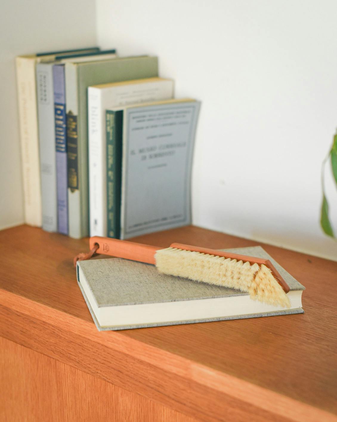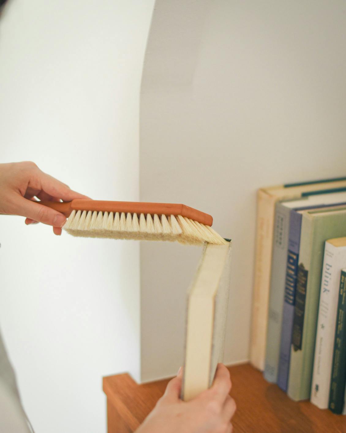 ブラシの先端は硬めの豚毛でできており、本の上部にフィットしながら細かな部分までお掃除できてとっても便利ですよ。