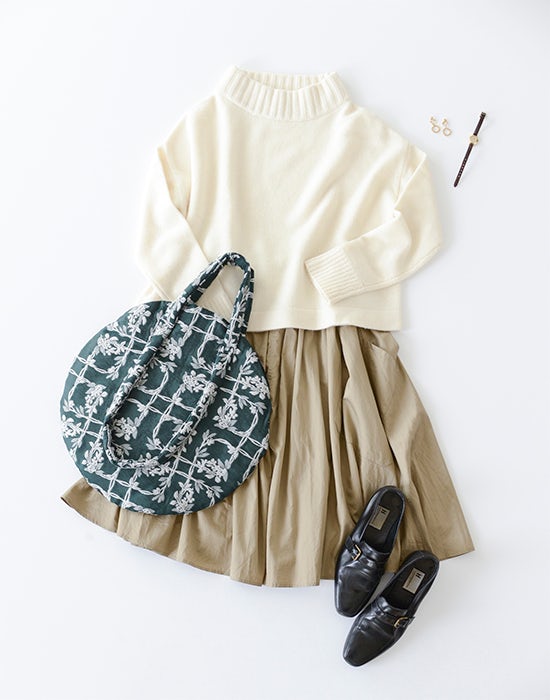 カラーは差し色になるグリーン。花模様が白なので重くなく、春先までずっと長く楽しめそうです。深みのある大人っぽい色合いは、定番のスタイルに取り入れやすいと思います。