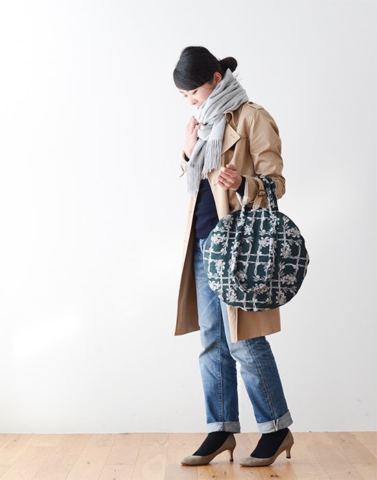 ひときわ目を引くのは、刺繍のように浮き出た花模様。丸いカタチが可愛らしいバッグは冬のコートスタイルに特別感をもたらします。