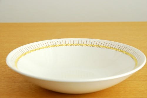 ぐるりと縁取られた模様はとても繊細なタッチで描かれ、白地にイエローの明るい色味が爽やかな印象です。