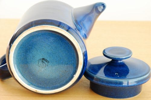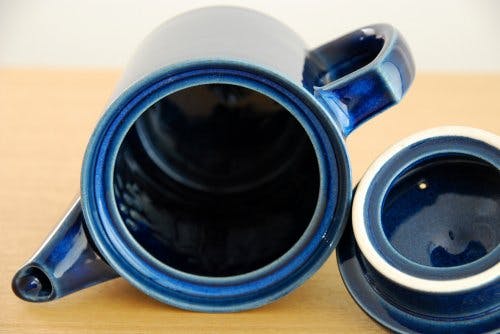 深いブルーがとても美しい魅力的なポットです。上からこちらのポットを眺めると、フタの持ち手部分が大きな丸の形をしているところがかわいいですね!