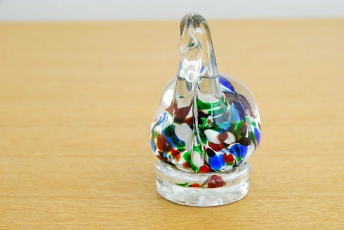 透明の美しいガラスの中に、青、白、緑、茶色、黒で美しく模様が描かれています。光にかざすと、ガラス部分がキラキラと反射してとても美しいです。
