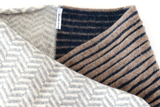 ウール100%のスヌードは、編み上げた生地を縮ませる縮絨(しゅくじゅう)という加工をし、4mmほどの厚みのある圧縮ウールに仕上げています。