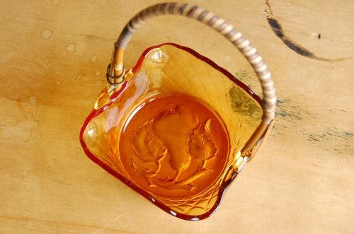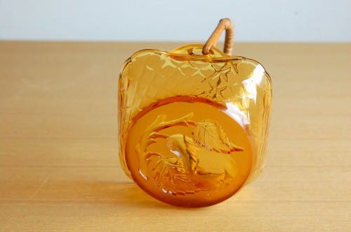 茶色のガラスが光に透けると、キラキラと光ってとても美しい小物入れです。