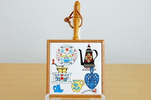 黒いシックなポットに、ハートがたの鍋しき、お花模様のプレート、キャンドルホルダーに、コーヒーミル。そしてお花模様の花瓶まで!北欧で長い間愛されてきたキッチン道具なのでしょうね。見ているだけで、にこにことご機嫌になってくるようなかわいい鍋敷きです。