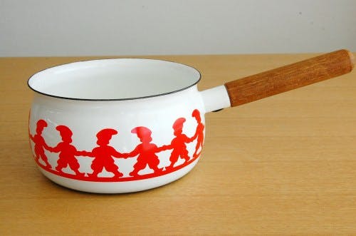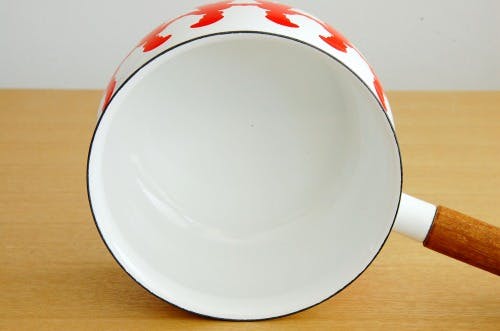 白地に赤い模様がアクセント。小人のような帽子をかぶった子供たちがグルリと手をつなぐ形で描かれていて、童心に返らせてくれるような可愛らしいデザインのミルクパンです。持ち手はチークでできています。