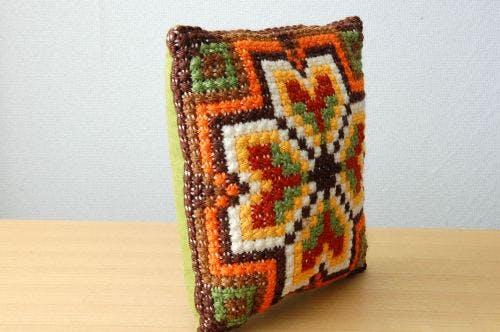 私(店長佐藤)も、つい先日のこと、こういう感じの古いクッションが欲しくて手に入れてしまいました。我が家には北欧のテキスタイルを使った新しいクッションもありますが、そのなかにひとつこういったテイストのヴィンテージのクッションが混じったことで、またぐっと温かみや味わいが増したというか・・・とても気に入っています。