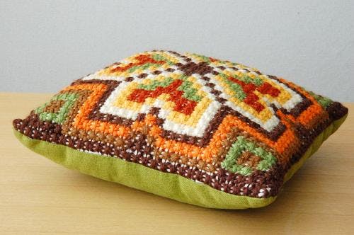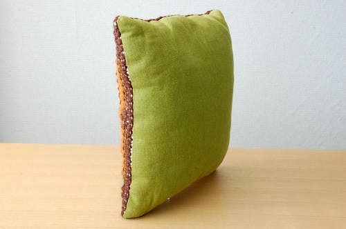 今回ご紹介するこちらのクッションは大きさもちょうど理想的って思いますし、毛糸で施された刺繍模様が素敵なだけでなく、裏面のオリーブグリーンの布地の色もすごく素敵です。手触りも気持ちいいですよ。