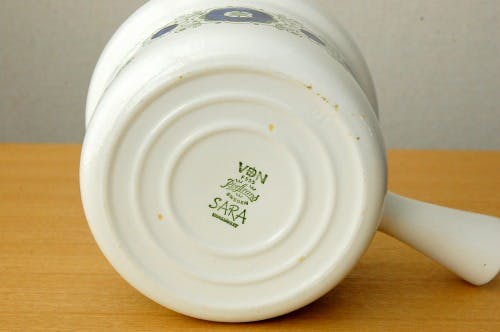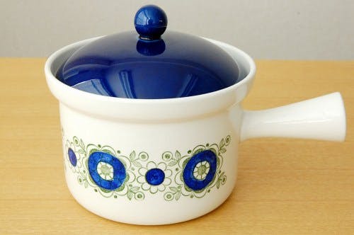 真っ白と、こっくりとした深い青の組み合わせがとてもきれいな片手鍋です。緑と青で描かれたお花が大人のかわいらしさを与えてくれています!