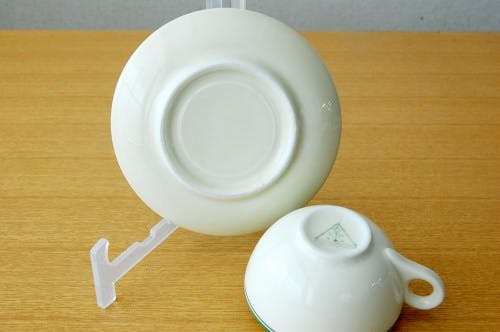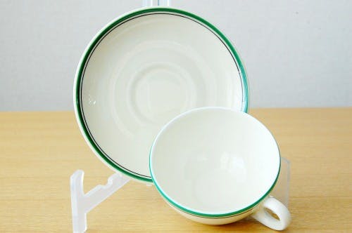 こちらのカップ&ソーサーは、小ぶりのサイズ感といい、優しいクリーム色の色合いといい、飲み口部分にはいったグリーンラインのシンンプルなデザインといい、個人的に(安田です)全てがツボに入ってしまったものです!本当に可愛い!