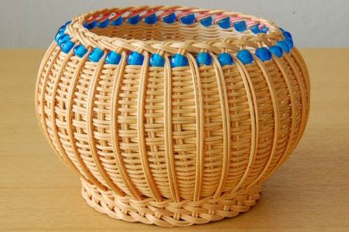 スウェーデンで見つけたブルーのビーズが編みこまれた可愛いバスケットです。