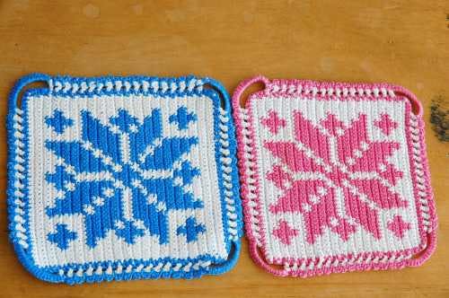 スウェーデンで見つけた手編みポットマット(鍋つかみ)2枚セット/雪の結晶・スクエアです。ブルーとピンクの2枚セットになります。