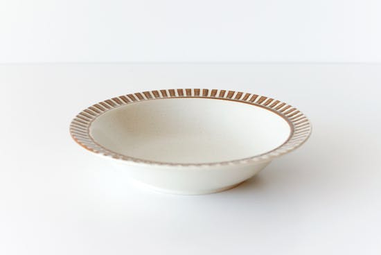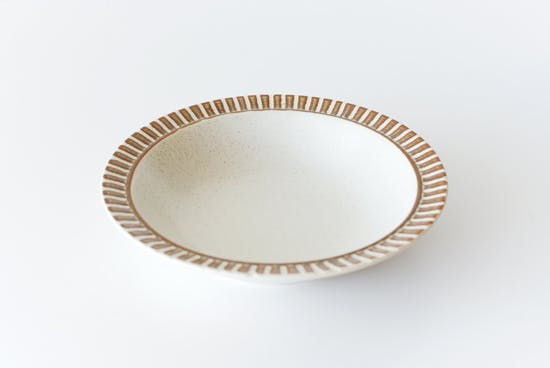 日本最大の陶磁器生産地、岐阜県土岐市でつくられた美濃焼のうつわ。1967年にグッドデザイン賞を受賞。レストランウェアとして、長くプロフェッショナルに愛されているシリーズです。一つひとつ手作業で削りだされたふち飾りに、日本のものづくりの心を感じます。