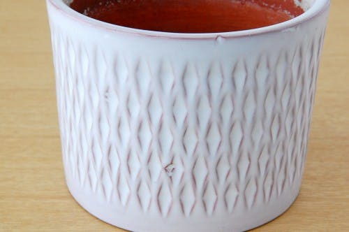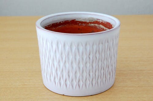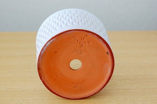 こちらは表面に彫り込まれた菱形の模様といい、トロリとした乳白色の色合いといい、本当に美しい佇まいの植木鉢だと惚れ惚れしてしまいます。