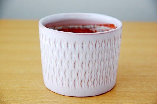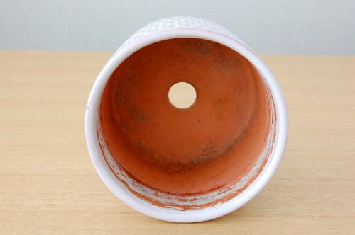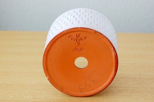 こちらは表面に彫り込まれた菱形の模様といい、トロリとした乳白色の色合いといい、本当に美しい佇まいの植木鉢だと惚れ惚れしてしまいます。