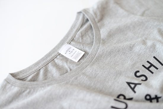 首のうしろのタグも、オリジナル仕様です。肌にちくちくしないようになっているんですよ。
