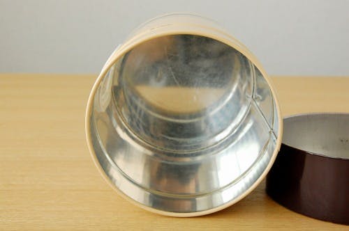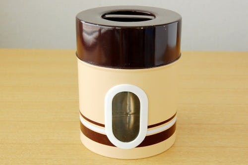 ブラウンのボーダー模様がレトロでキュートな印象をうけるブリキ缶です。キッチンにぽんと置いておくだけでお部屋の印象が変わりそうです。