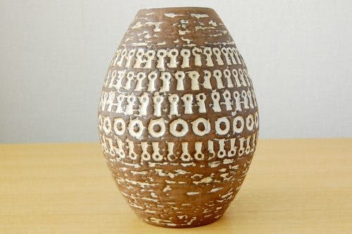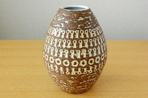 やっぱりMari Simmulsonの作品は素晴らしい!の一言ですね!こちらの花瓶も、素朴さと力強さに満ち溢れた本当に魅力的な作品です。花瓶に施された一見すると鍵のようにも見えるモチーフが個性的で渋すぎます!