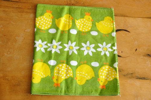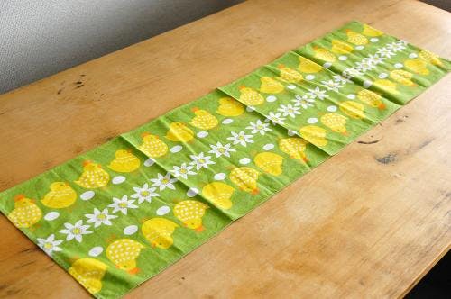イエローとグリーンの明るい色使いといい、ヒヨコやお花の絵柄といい、ほのぼのした楽しさいっぱいのテーブルランナーです。オススメです!