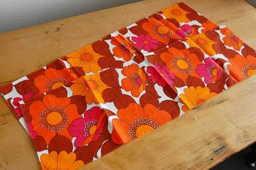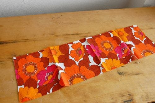 オレンジの明るい色合いとレトロな雰囲気の花柄が可愛いこちらのカフェカーテン。こんな布地のワンピースがあったら着てみたいなと思わせる、すごく素敵なテキスタイルでもあります。