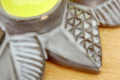 初めて手に取った感動はすごいものでした。真ん中のお花模様とそれを囲む葉っぱ模様が立体的に表現されており、壁にかけてみると、正面から見ても、ちょっと側面から見ても違った表情を楽しませてくれます。