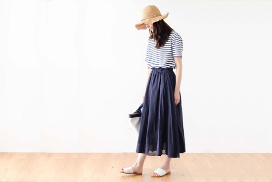 (トップス:PETIT BATEAU、キャミソール:nest Robe、ボトム:coen、バッグ:DRAGON、ストール:BONTON)