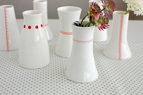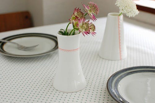 その名前の通り、真っ白な布の上を赤い糸でチクチクとステッチしているような、縫い目の模様が描かれた本当にキュートな花瓶です。