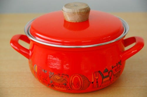 オレンジ色とレッドの中間のような鮮やかな色合いのお鍋に食べ物やキッチンツールなど「食」にまつわる可愛い絵柄がつけられています。特にコーヒーミルやフライパンなどの絵はとても可愛いです。
