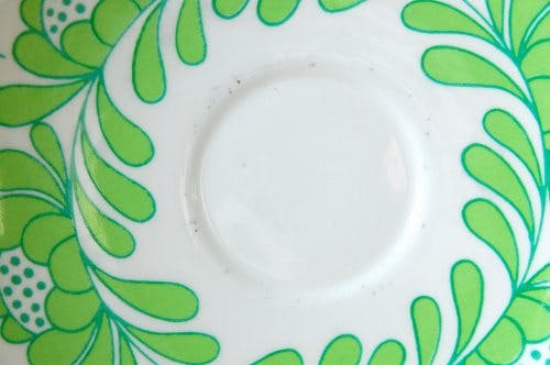 コンディションとしてはソーサー中央のカップと接してきた部分が経年使用によるスクラッチで黒っぽく擦れた跡となって残っていますが、ご使用の際はほとんど気にならないものかもしれません。またカップの内部底面に製造過程で釉薬に付着した黒っぽい極小の点々が見られますが、こちらは汚れではございませんのでご使用に差し支えるものではないかと思います。
