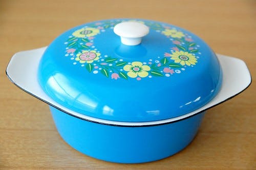 コクムス社のお鍋の中でも人気の高いデコレーションのシリーズです。それもそのはず、爽やかな空色をベースにして、蓋の部分にはお花畑のような可愛い模様。人気が高いことにも素直に頷けます。